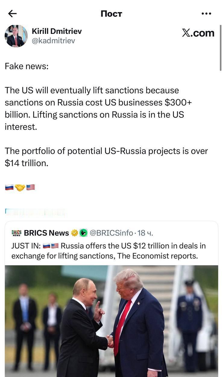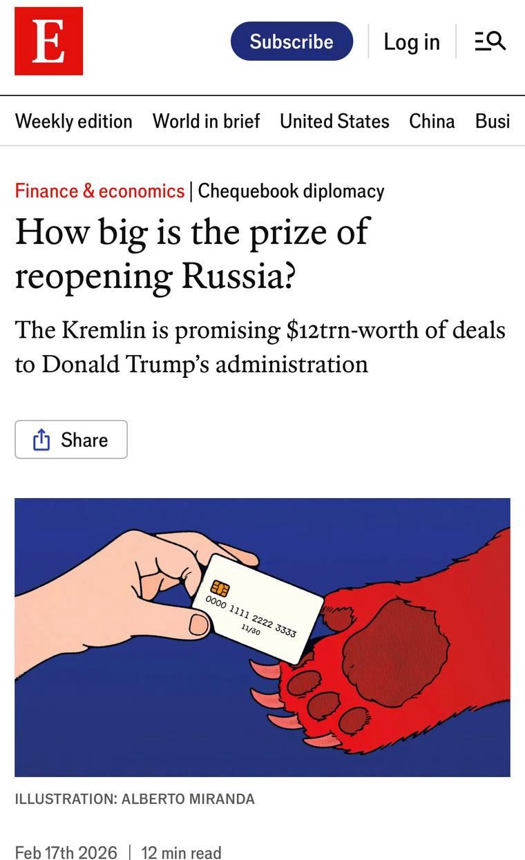 俄罗斯那边负责对外投资的总统特别代表德米特里耶夫,最近出来说了件事。 他说《经济学人》那篇报道是假的。那篇报道说俄罗斯打算给美国送价值12万亿美元的项目,换美国解除制裁。德米特里耶夫在自己的社交媒体上直接说,这不属实。 不过他也没把门关死。他说解除制裁这事,最后看的还是美国自己的利益。美国公司退出俄罗斯市场,已经亏了3000多亿美元。他还提了一句,俄美之间潜在的合作项目,加起来可能超过14万亿美元。 这个说法是怎么来的呢。 最早是乌克兰那边爆出来的。泽连斯基2月初说,乌克兰情报部门拿到了一份文件,叫“德米特里耶夫方案”,里面写的是俄美在秘密谈一个12万亿美元的合作计划。作为交换,美国默许俄罗斯控制乌克兰领土。这消息一出,舆论就炸了。 12万亿美元是什么概念。俄罗斯2025年的GDP也就2.7万亿美元左右,12万亿相当于它四年多的经济总量。数字本身就离谱。 但美俄之间确实在接触。德米特里耶夫和特朗普的特使威特科夫,在阿布扎比和佛罗里达都谈过。谈的是能源、矿产、金融结算这些东西,也在试着推乌克兰停火。泽连斯基那边急的是,美俄谈归谈,不能背着乌克兰谈乌克兰的事。他反复说,任何协议必须有乌克兰参与,领土问题不能让步。 美国这边,特朗普政府想在6月前把事办完,赶在中期选举前有个交代。但白宫一直没证实12万亿美元这个说法,只说谈的是互利项目。 欧洲也被晾在一边。德法担心西方联盟被削弱,欧盟内部还在喊维持制裁。 现在的问题有几个。第一,12万亿美元这个数太夸张,根本不是俄罗斯能拿出来的。第二,美国国会把多数对俄制裁都写进法律了,要解除得跨党派支持,阻力很大。第三,俄罗斯这些年一直在推去美元化,现在说要重返美元结算系统,和自己政策打架。 德米特里耶夫否认了具体金额,但承认有对话。泽连斯基的爆料,把这层窗户纸捅破了。乌克兰担心的是,大国在谈利益分配的时候,自己的主权被当成筹码。 所谓的“天价项目”,更像是一个谈判工具,或者舆论战的武器。真正要谈的,还是停火条件,不是单纯的经济交换。俄罗斯财富 俄罗斯资产动用