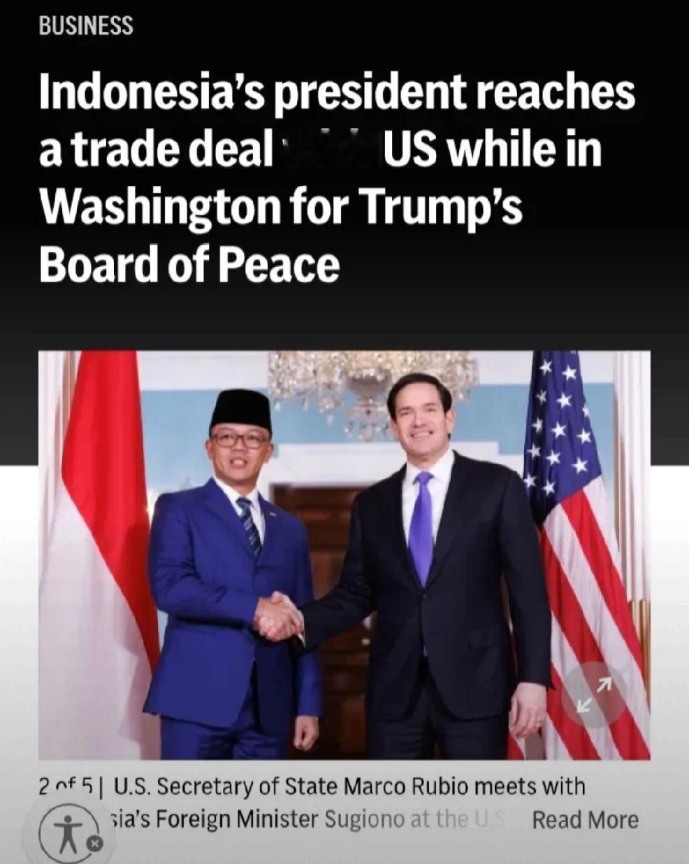 2月20日美联社报道白宫周四宣布与印度尼西亚达成互惠贸易协议。根据协议,东南亚最大经济体将取消99%的美国商品的关税而美国将维持对大多数印尼商品的19%的关税,这与美国对柬埔寨和马来西亚设定的同步速度相同。白宫表示,印尼还同意解决对美国商品的非关税壁垒,并取消对关键矿场及其他工业商业出口的限制。 个人认为:为何会这样?因为印尼金融市场的极端变化,决定了印尼现在的行为。 或者说印尼已经被美国割了韭菜,无力反抗。 假如印尼要是不服,美国便会使得印尼国不像国,人不像人。 个人认为:金融武器比核武器还要威力巨大。