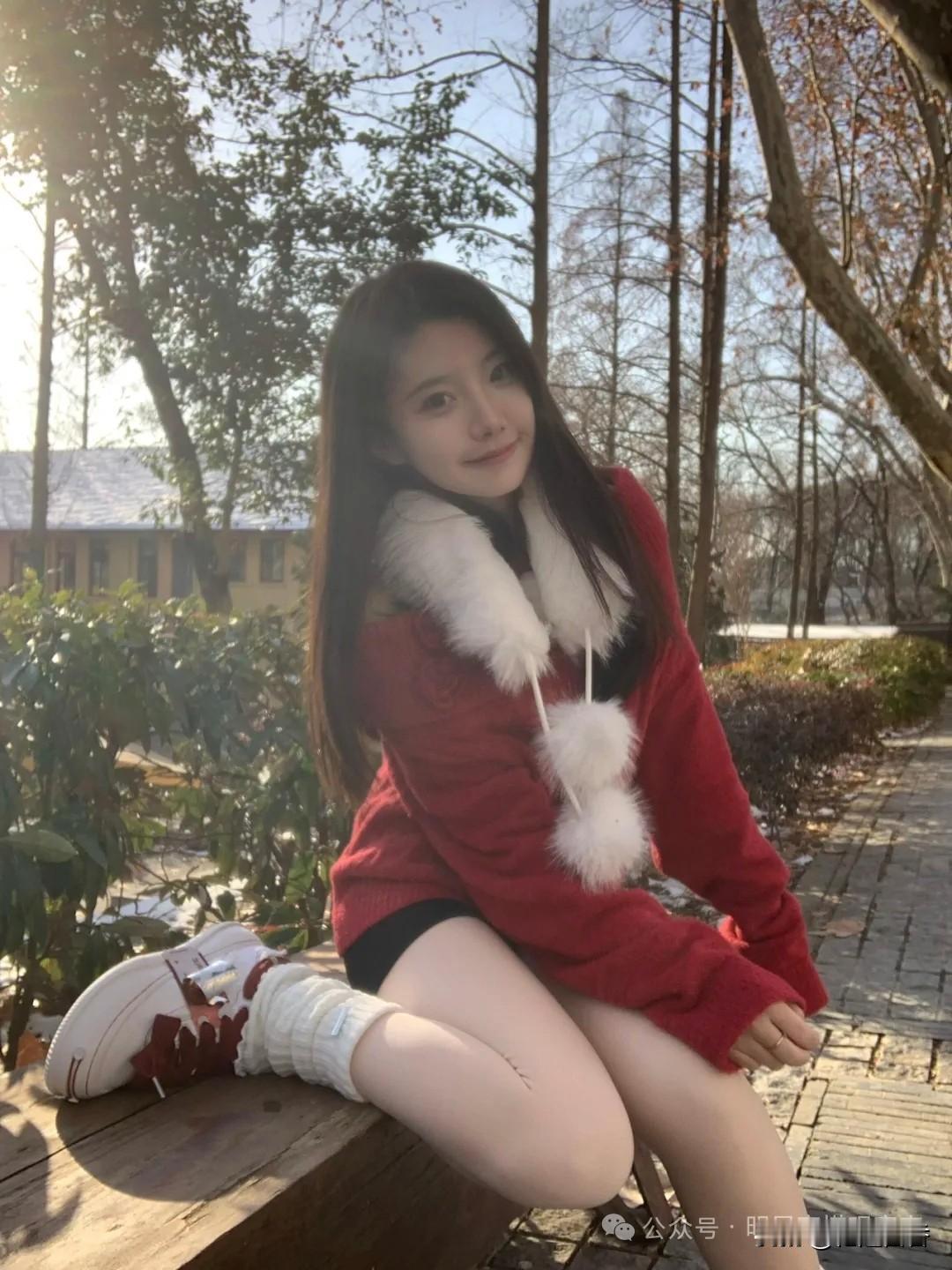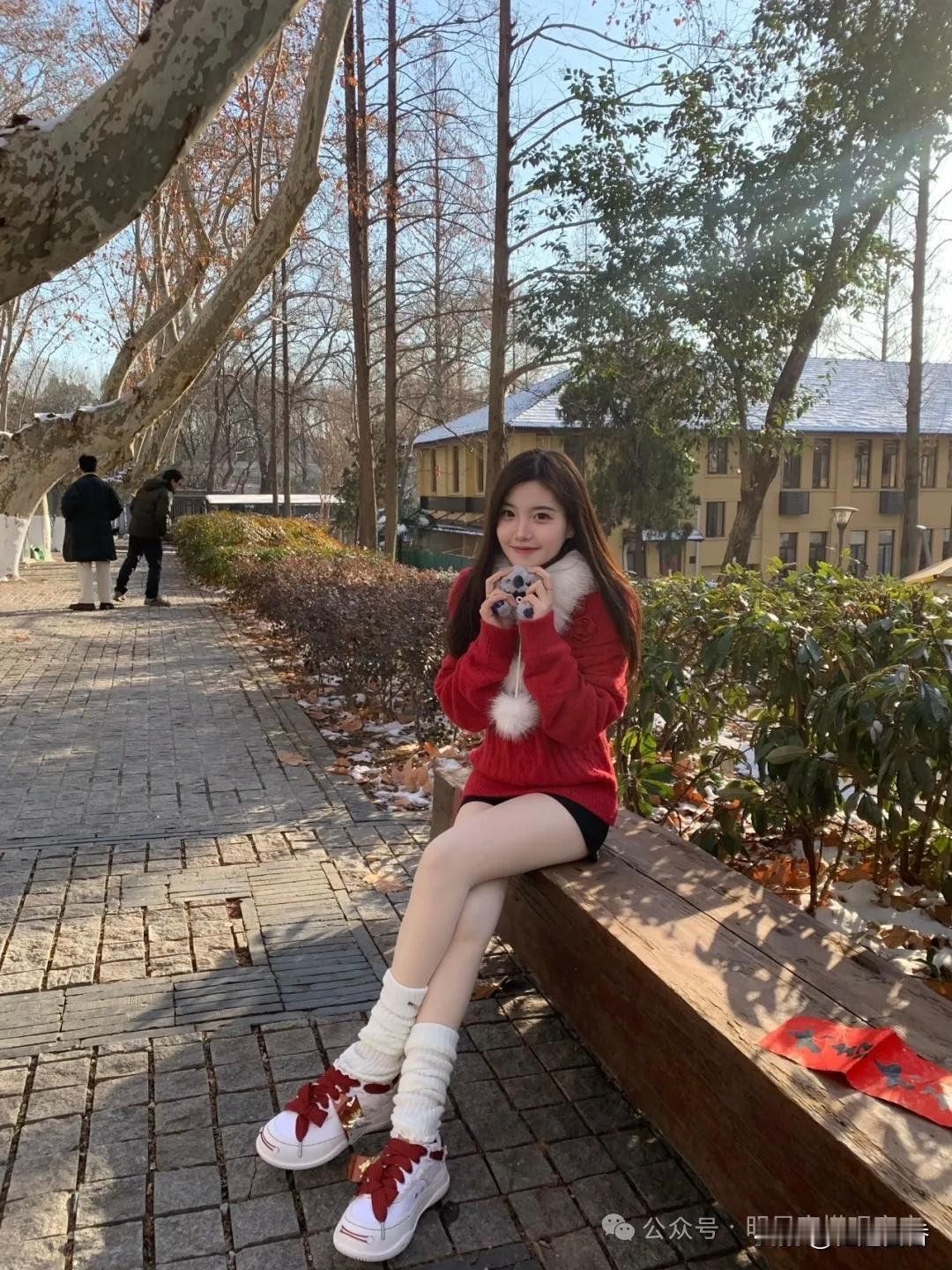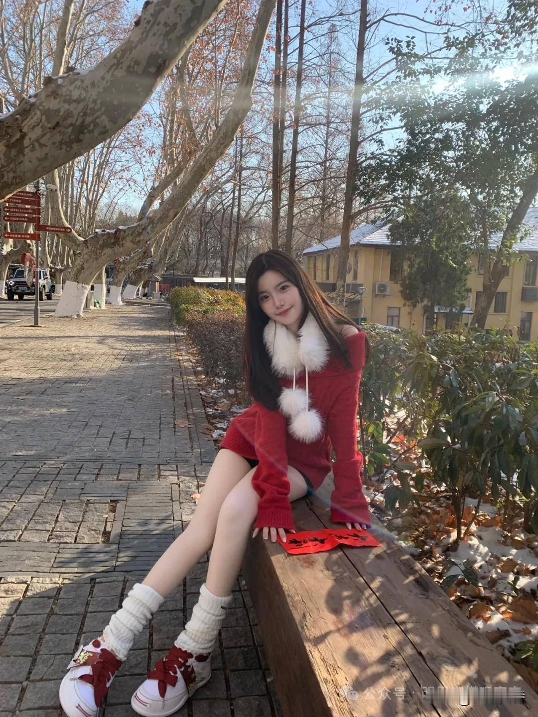 冬日暖阳下,红衣少女倚长椅,静享美好时光。🌞💕