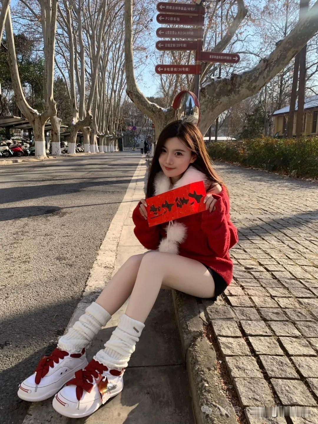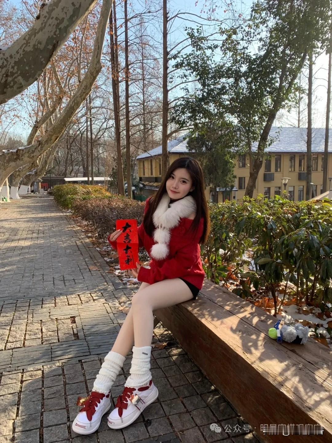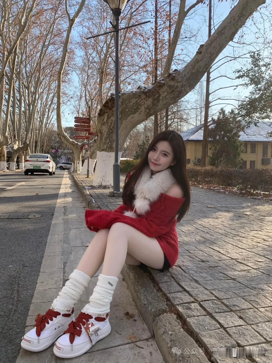 冬日暖阳下,红衣少女倚长椅,静享美好时光。🌞💕