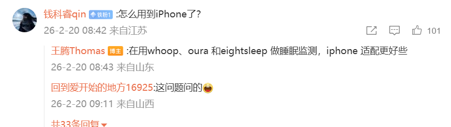 王腾回应换iPhone17新的一年,王腾直接换掉了之前用的小米手机,用上了iPhone 17,为什么换成iPhone,王腾也回应:“在用whoop、oura和eightsleep做睡眠监测,iPhone适配更好些。”