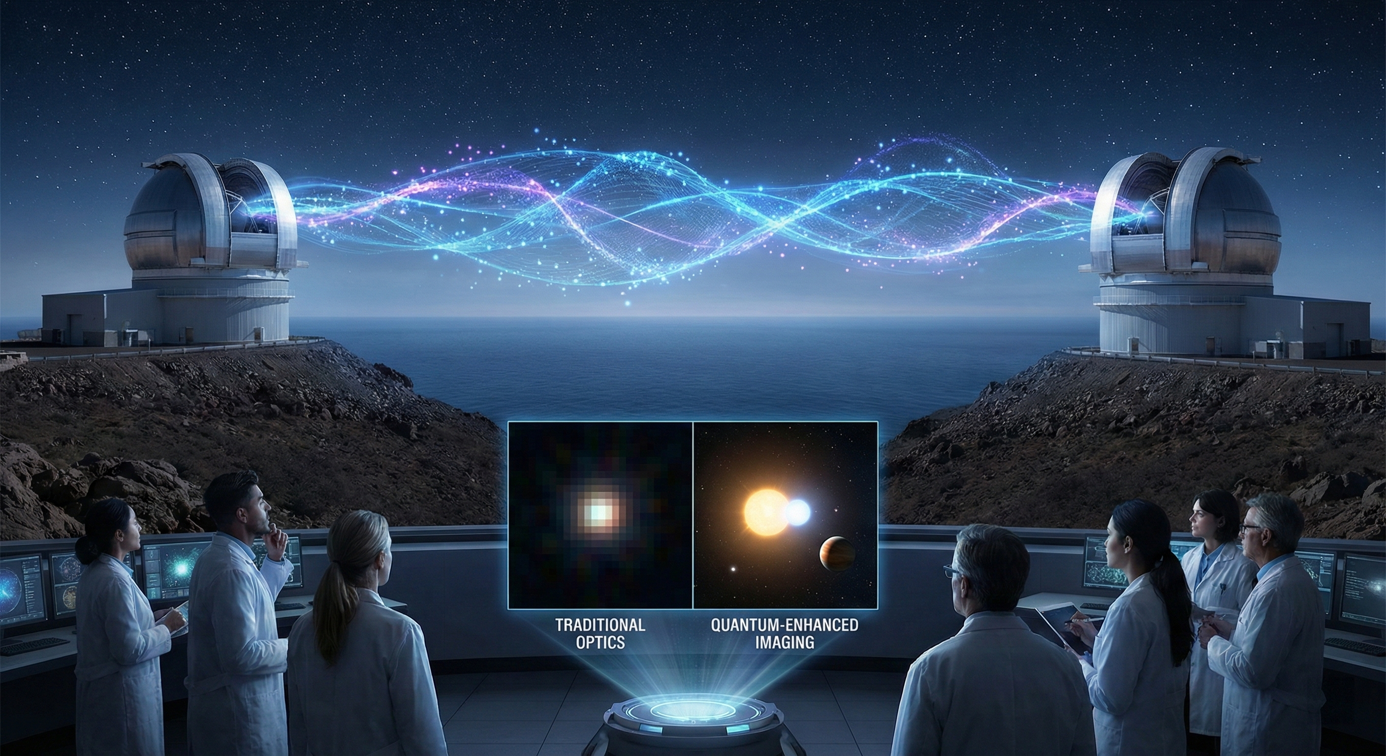 精妙之处就在这里。预先分发到两地的纠缠量子对,就像一条无形的纽带横亘在两台望远镜之间。科学家借助这条纽带,再配合一条普通的经典通信信道,在两地各自执行一套精心设计的量子操作。两台望远镜从头到尾都没有交换过任何光信号,却能提取出只有把星光真正汇聚到同一处才能得到的联合信息。光没有移动,但信息完成了“会师”。