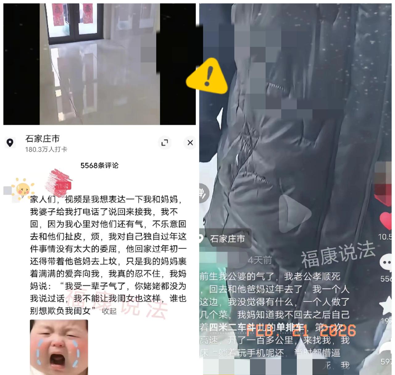 泪崩了!河北石家庄,女子年前和公婆闹了矛盾,可丈夫孝顺回老家和父母过年去了,让女子一人在家过年,本来她觉得没啥,自己乐得自在,可女子妈妈知道女儿受了委屈后,从没上过高速的她,愣是开着货车跑了100多公里来给女儿撑腰,当女子看到母亲拎着东西进门那一刻,她放声痛哭,妈妈和她说了一句话,女子再次泪崩了。 嘴上说一个人过年更轻松,不过是硬撑出来的坚强,没人疼的时候,只能假装无所谓。真正疼你的人,从不会让你独自受委屈,这位妈妈从没跑过高速,却为了女儿豁出一切,这份偏爱就是女人这辈子最硬的底气。 婚姻里最扎心的不是婆媳矛盾,而是丈夫缺位,把委屈全丢给妻子一个人扛。孝顺没有错,但不能牺牲妻子的感受来成全孝心,好的婚姻,从来不是让一方妥协退让,而是丈夫懂得护着妻子,平衡好两边的关系。 娘家永远是女儿的退路,妈妈那句“我受了一辈子气,不能让我闺女也这样”,看哭无数人。女人婚后最大的安全感,从来不是勉强融入婆家,而是有人无条件站在你这边。 这件事你怎么看?你觉得过年夫妻该各回各家,还是丈夫该多顾及妻子感受?