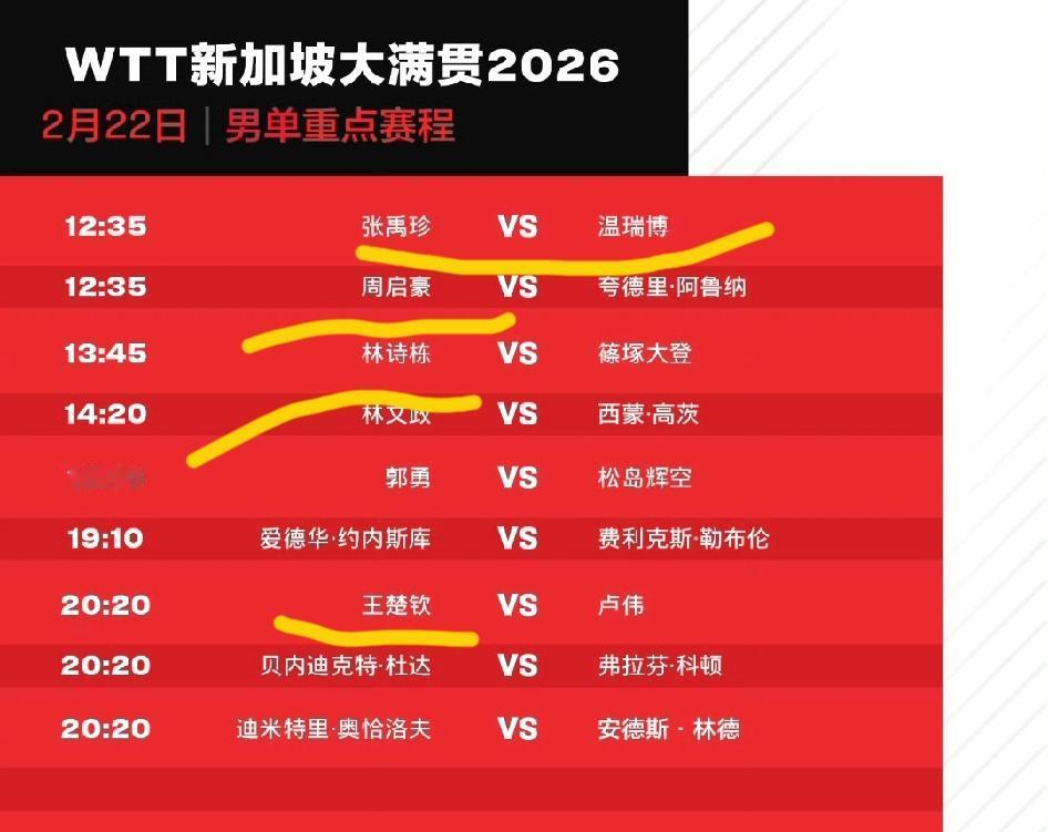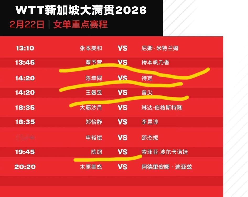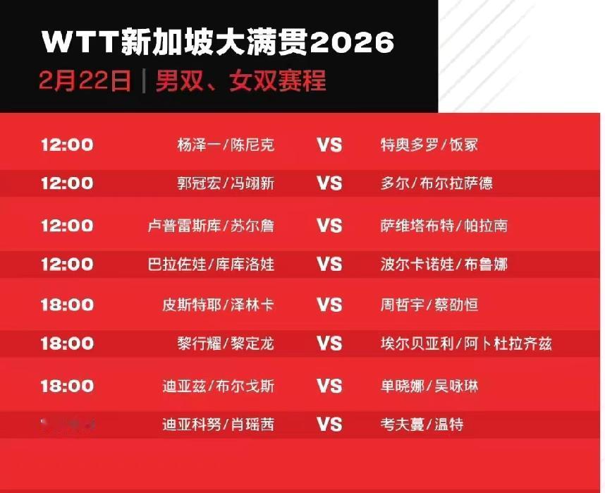 【2026新加坡大满贯国乒赛程】 明日,2月22日,打响正赛, 首日国乒8人出战 1、12:35,温瑞博 VS 张禹珍 2、12:35;周启豪 VS 阿鲁纳 3、13:45,林诗栋 VS 篠塚大登4、13:45,覃予萱 VS 桥本帆乃香 5、14:20,王曼昱 VS 曾尖 6、14:20,陈幸同 VS 选手待定 7、19:45,陈熠 VS 波尔卡诺娃 8、20:20,王楚钦 VS 卢伟 小蘑菇加油冲啊,第一轮就怼上桥本,而且自己偏下风,之前还没有战胜过她! 都说女单下半区有张本美和,签位硬;上半区的桥本也不是那么好打呀,消费体力! 小温对阵张禹珍,希望小温能稳定发挥,多长心眼,跟老将打,千万不能急躁,否则,毫厘之差,就可能导致战况的变化!看好小温,加油[点亮平安灯][点亮平安灯][点亮平安灯][加油] 7号对阵阿鲁纳,非洲一哥这签才叫硬,直接硬刚国乒,7号最近状态不错,亚洲杯,如果不是提前遇到楚钦,有可能打进决赛的! 精彩赛事,不容错过!快快收藏起来,一起为国乒加油[点亮平安灯][点亮平安灯][点亮平安灯][加油] 冬日生活打卡季 乒乓球