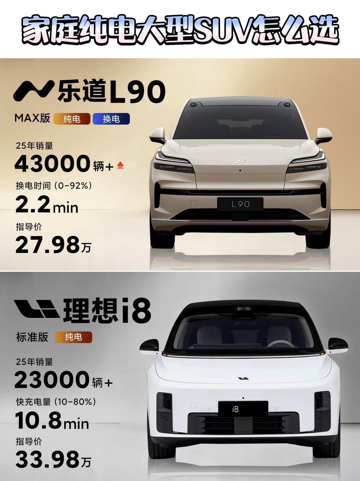 这两款35万级纯电大型SUV,代表了2026年市场中两种截然不同的家庭出行解决方案:乐道L90是换电实用派,理想i8则是全能科技派。 - 两车核心定位速览 车型 核心优势 适合人群 乐道L90 5145mm车长+3110mm超长轴距+900V平台+蔚来换电体系+29.68万起 追求极致空间、看重补能效率、预算敏感的家庭用户 理想i8 5C超充(10分钟500km)+VLA大模型智驾+双腔空悬+冰箱彩电+33.98万起 追求智能科技、豪华舒适、一步到位的多孩家庭 - 乐道L90:29.68万起的“换电实用派” 2026款马到成功版以国宝“马踏飞燕”为设计灵感,5145mm车长+3110mm轴距带来真正的三排尊严——第三排膝部空间超1米,成年人也能舒展双腿。全系标配240L前备箱,6座版后备箱430-1214L。 核心体验:基于900V高压平台,后驱版340kW/5.9秒破百,四驱版440kW/4.7秒破百,85kWh电池提供570-605km续航。最大杀手锏是接入蔚来换电体系,3分钟满电出发。Ultra版标配空气悬架+魔毯智能悬挂,能提前扫描路面调整阻尼。内饰17.2英寸3K屏+8295芯片+小乐GPT大模型,支持20秒连续对话。马到成功版标配专属凝夜紫车色+头枕刺绣,文化寓意拉满。 真实痛点:Pro版为后驱+单腔空悬,四驱需上Ultra;车机生态仍需完善。 - 理想i8:33.98万起的“全能科技派” 2026款i8以“游艇”造型+0.218Cd超低风阻吸睛,5085mm车长+3050mm轴距,三排180mm中央过道+纯平地坪,真正实现“座座皆旗舰”。 核心体验:全系标配97.8kWh 5C三元锂电池,CLTC续航720km,实测10分钟补能500公里。双电机四驱400kW/4.5秒破百,标配双腔魔毯空气悬架,烂路开出松弛感。智驾搭载NVIDIA Thor芯片+VLA大模型,支持车位到车位全场景NOA,能预判加塞。座舱双15.7英寸3K屏+8295P芯片+理想同学智能体,支持模糊指令如“肩膀冷”自动调风向。Max版标配冷暖冰箱+21.4英寸后舱娱乐屏。 真实痛点:Pro版电池90.1kWh/670km续航,无后舱娱乐屏;HUD界面初次使用略杂乱。 - 一句话总结:要空间+换电买乐道L90 Ultra版,29.98万起3110mm轴距+蔚来换电+4.7秒加速,家庭出行的实用主义巅峰;要科技+豪华买理想i8 Max版,33.98万起5C超充+VLA智驾+双腔空悬+冰箱彩电,一步到位的科技旗舰。