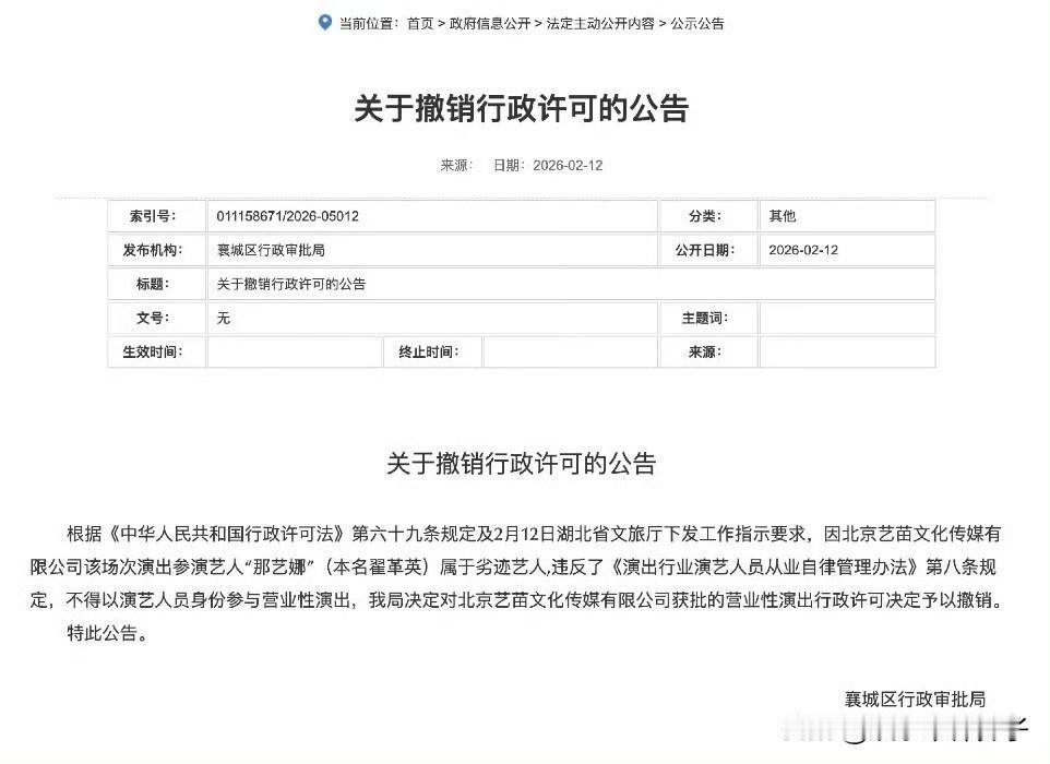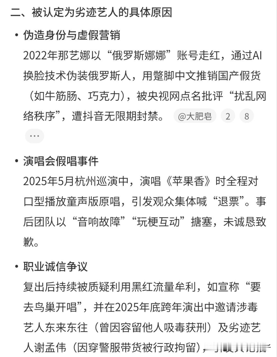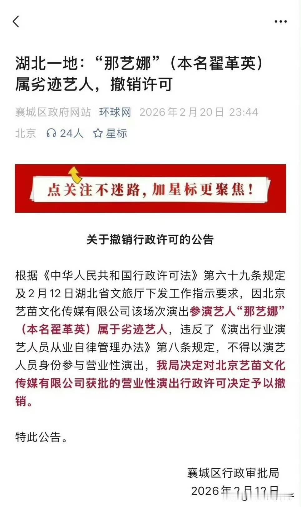 被定性为劣迹艺人,这回不嘚瑟了吧! 2月21日,据媒体报道,艺人那艺娜(本名翟革英)被认定为劣迹艺人,演出也被叫停,官方发布公告。 据悉,那艺娜以前的演出非常受欢迎,人气特别高,说实话,恕我孤陋寡闻,都没听过这个名字,特意到网上科普一下。 这么一看,我滴乖乖,真的是劣迹斑斑,不仅伪造外籍身份博眼球,而且还卖假货,巡演时假唱,全程对口型,多次引发争议,还曾被央视网点名批评…… 就这样,还想出来巡演,脸皮可真厚,这下好了,被认定为劣迹艺人,不嘚瑟了吧! 看到消息,一些网友纷纷留言,表示大快人心,可见,那艺娜这口碑早就崩塌了。 正所谓,从艺先从德,知名度再高,再有才华,作为公众人物,也要传递正能量,不然,肯定凉凉!