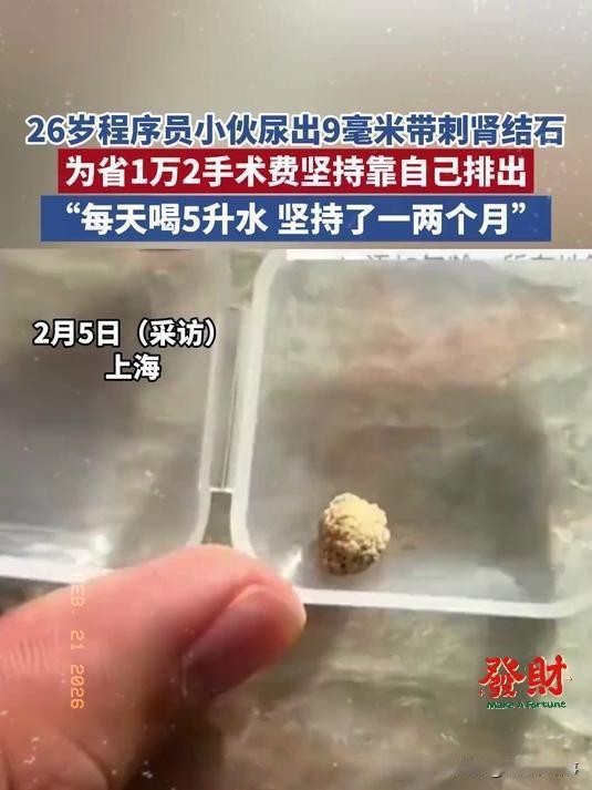 真是一个狠人啊!小伙为了省12000手术费,每天喝五升水,结果尿出9毫米结石!小伙:"尿出来的那一刻,整个人轻松了!"网友:3mm差点没疼背过去,这个9mm居然能忍的住疼! 咱先把话说明白,9毫米的尿路结石,根本不是小毛病!医学上早就有定论,尿路结石只要超过6毫米,自然排出的概率就极低,常规治疗就是做微创手术,费用正好是小伙想省的12000块,这钱对普通打工人来说,可不是小数目。 换做旁人,查出这么大的结石,早就乖乖去医院办手续了,可这小伙偏要硬扛。不是他不怕疼,是真舍不得这一万二——那可能是他两三个月的血汗工资,是家里的柴米油盐、孩子的零碎开销,攥在手里都怕花错,哪能轻易交给医院? 于是他憋出了最笨也最狠的办法:每天往肚子里灌5升水!5升水啥概念?就是10瓶普通矿泉水,正常人一天喝2升都撑得胃胀反酸,他从早到晚抱着水杯,刚排空又续满,跑厕所跑到腿发软,膀胱憋得发胀,连吃饭都没心思,全程就靠一股劲死撑。 最熬人的还不是喝水的难受,是结石带来的剧痛!懂的人都知道,肾绞痛是出了名的“酷刑级疼痛”,比刀割、骨折还磨人,网友说3毫米的结石都能疼到背过气、直打滚,这9毫米的结石卡在尿路里,每一次身体蠕动、每一次排尿,都是钻心的撕裂疼,腰腹像被无数根针乱扎,疼得他浑身冒冷汗、嘴唇发白,却愣是没去过一次医院。 为了让结石往下走,他除了猛喝水,还偷偷加了“实战操作”:上班间隙踮脚蹦跳,下班回家原地跺脚,就想靠重力把结石震出来,腿跳得发酸发麻,腰疼得直不起身,熬了一天又一天,眼里全是熬出来的红血丝。 就这么硬生生扛了不知多少天,终于在一次排尿时,那枚9毫米的结石彻底排了出来!小伙轻描淡写的一句“整个人轻松了”,藏着的是数不清的隐忍和疼,哪是轻松,分明是从鬼门关闯了一遭。 网友们炸锅不是因为他离谱,是因为太共情了。谁都知道硬扛结石极危险,过量喝水可能水中毒,结石划伤尿路还会引发感染,可在生活的压力面前,太多普通人都会选择先扛一扛、能省则省。 这事儿看着硬核,实则扎心,小伙不是傻,是被生活逼出了韧劲。9毫米的剧痛忍得住,一万二的开销舍不得,这就是最真实的普通人模样。万幸他最后平安排石,没出意外,也真的想劝一句:再省钱也别拿身体硬扛,健康才是最金贵的本钱。 各位读者你们怎么看?欢迎在评论区讨论。