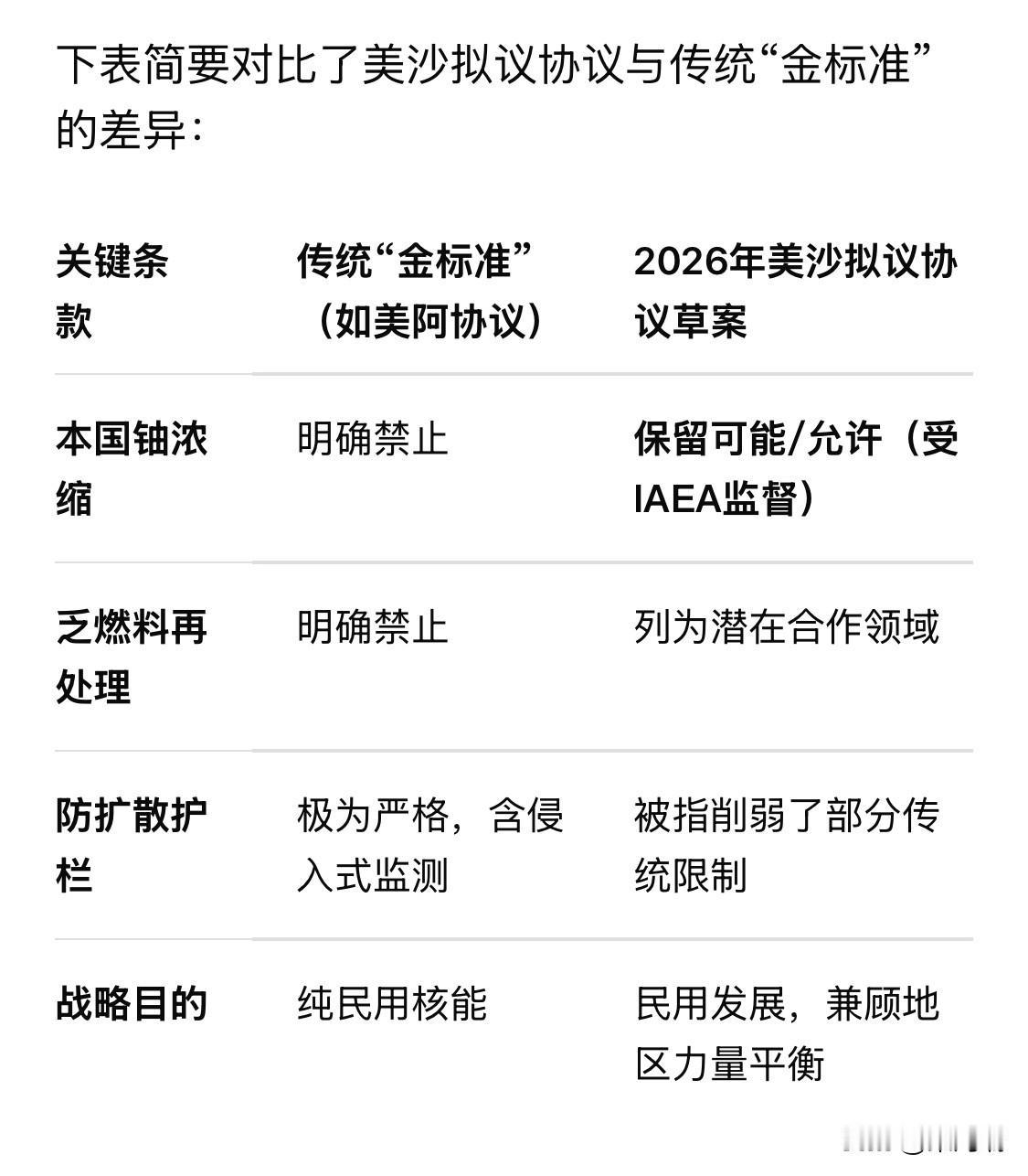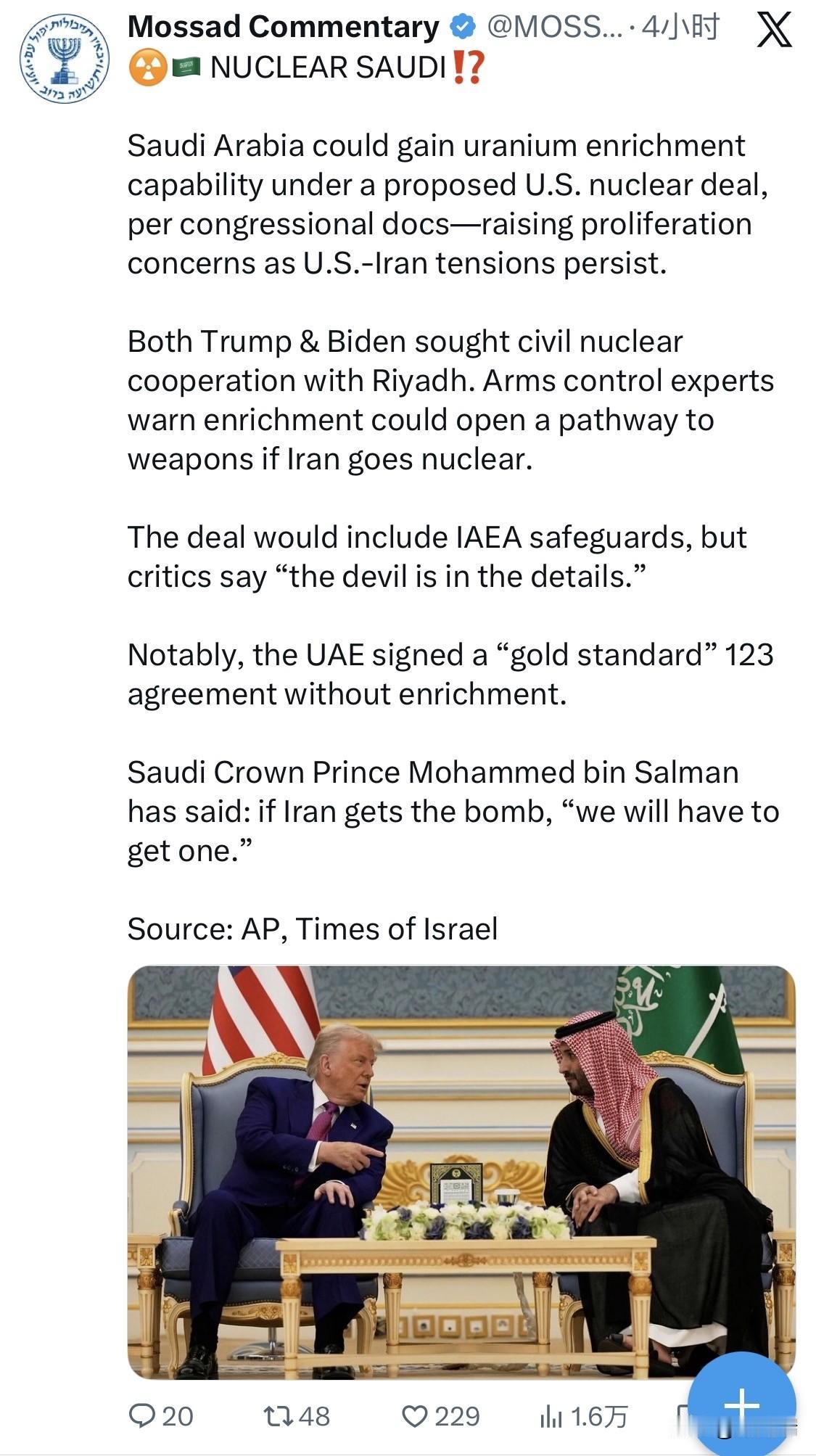根据2026年2月公布的国会文件及相关报道,特朗普政府拟议的一项美沙民用核合作协议(即《123协议》)草案显示,沙特阿拉伯可能被允许在境内进行某种形式的铀浓缩。这一动向打破了美国此前在核能合作中坚持的防扩散“金标准”,引发了国际社会对中东地区核军备竞赛的严重担忧。 协议核心内容与争议 铀浓缩许可: 根据泄露给核军备控制协会(ACA)的报告,拟议的协议为沙特在本国开展铀浓缩计划敞开了大门。文件提到,双方将针对“最具扩散敏感性”的领域制定额外的保障和核实措施,明确列出的领域包括铀浓缩、燃料制造和核燃料再处理。 削弱“金标准”: 相比之下,美国与阿联酋签署的核协议被视为“金标准”,因为阿联酋明确承诺放弃在本国境内进行铀浓缩和再处理。而目前的草案被认为缺乏足够的防扩散“护栏”。 国际监督: 协议草案要求沙特与国际原子能机构(IAEA)签署保障协定,由IAEA对敏感核领域实施监督。但专家指出,目前的安排可能不包含更严格的侵入式监测程序(如《附加议定书》)。 地缘政治背景与扩散隐患 对标伊朗: 沙特王储穆罕默德·本·萨勒曼曾多次明确表态,“如果伊朗拥有核武器,沙特也必须拥有”。这一立场使得沙特获得铀浓缩技术(制造核武器的关键步骤之一)变得极具敏感性。 美伊紧张局势: 该协议推进之际,美伊正就核问题进行博弈。如果美国允许沙特拥有浓缩能力,可能会促使该地区其他国家(如土耳其、阿联酋)也寻求同等权利。 外部核援助选项: 有迹象显示沙特正在寻求多方保障。2025年,沙特与巴基斯坦签署了共同防御协议,巴方官员曾暗示在必要时其核能力可向沙特开放。 国会与国际社会的反应 国会制衡: 特朗普政府预计最快于2026年2月22日向国会正式提交《123协议》。根据法律,国会有90天的时间进行审查。除非参众两院均通过反对该协议的决议,否则协议将自动生效。 以色列的反对: 以色列方面对此表示高度警惕。尽管美沙以三方曾有过外交正常化的讨论,但以色列长期反对任何中东邻国获得铀浓缩能力,担心这会引发不可控的核军备竞赛。 安全风险: 军控专家警告称,即便沙特目前承诺和平利用核能,一旦境内出现旋转的离心机,就等于为通往核武器的大门留下了缝隙。