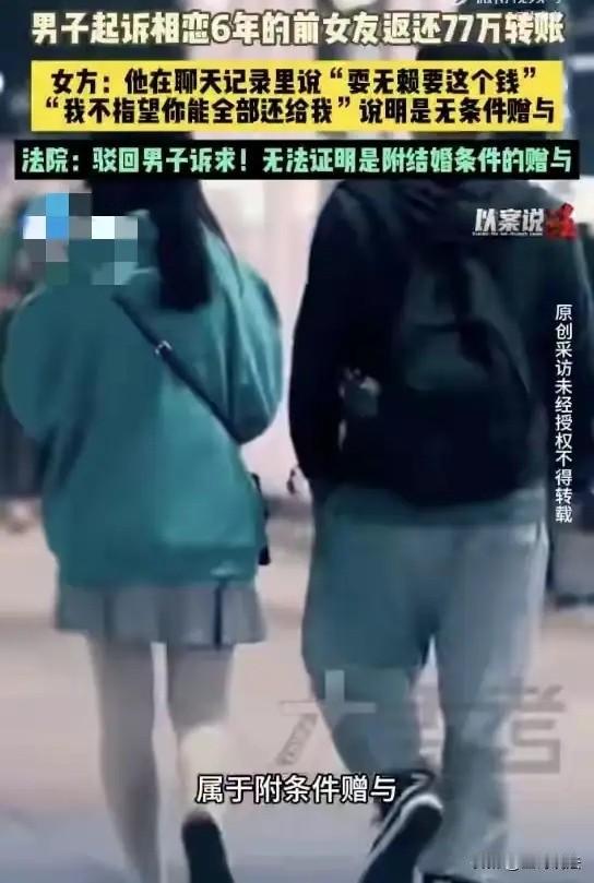 “想白 嫖?”四川成都,一男子和女友是大学同学,俩人恋爱6年,男子给女友转款77万,他告诉女友,我的钱就是你的钱!谁知感情慢慢变淡,最终俩人分手,男子立马变脸要钱,男子认为,这些钱是他以结婚为目的的赠与,既然结不了婚,女子必须全部返还,可女子认为,我和你谈了6年,钱是你自愿给的,又不是我逼你!男子告到法院,判决令人意外! 李某和王某是大学的同学,大二的时候,他们就开始热恋,他们感情稳定,一直到了毕业,俩人决定不回老家,一起在外打拼事业。 李某做了一名销售,他能说会道,很快就熟悉了工作,他四处奔波,很快就有了较多的收入。 李某有了收入,第一个就想给王某购买礼物,在他心里,王某就是他未来的媳妇。 他对王某万般的宠爱,给她花钱,李某心甘情愿。 而王某毕业之后,进了一家培训机构,她文质彬彬,做了一名培训老师,她收入稳定,但是薪水并不丰厚。 他们初出茅庐,还有很多美好的憧憬,俩人一起吃苦打拼,希望将来能买下自己的房子。 他们省吃俭用,艰辛而又充满着甜蜜。 随着时间的推移,李某渐渐做出了成绩,他做销售,攒下了不少的客户。 客户一多,他的收入就水涨船高,工资涨了,提成也就多了。 他得意洋洋,从最初的小打小闹,开始大手笔的给王某花钱。 王某不好意思,虽说俩人还在恋爱,可是毕竟还没到领证结婚的地步。 开始时候,李某给王某花几十几百,到了后来,就花几千上万,甚至到了最后,直接就给王某转账,花完再挣,他出手大方。 王某推辞了几句,要他把钱留好,将来办大事情。 可李某满不在乎,他告诉王某,我的钱就是你的钱,你不要担心,你放心花吧! 之后,王某要买电脑,李某花了8000元给她。 王某家里有事,李某直接给她转了20000。 到了最后,俩人俨然一副夫妻的模样,王某也已经习惯,李某给了她就接着,反正结婚也是迟早的事情。 可万万没有想到,随着时间的推移,感情接受不了漫长的磨砺。 俩人慢慢发现,他们没了共同的话题。 上学时的纯真早就消磨殆尽,他们由于习惯,勉强维持到了恋爱第6年。 不知道从啥时候开始,俩人开始频繁的吵架,王某嫌他总在外面,根本没时间多陪自己。 可李某委屈,我不陪着客户,哪来的钱让你花,我不陪客户,我们的房子啥时候才能攒够首付! 说着说着,俩人都感到委屈,李某发火,王某哭泣。 到了最后,感情成了鸡肋,俩人相看两厌,就连沟通都懒得再张口。 王某思前想后,决定抛下这段感情,既然感情已经变味,那就没必要再折磨对方。 不如好聚好散,互相还能留下一点体面,王某和李某商量,不如我们就此别过,放过对方,也放过自己。 谁知李某一听,当场翻脸,想分手可以,这些年我给你了77万,是时候还了,那是以结婚为目的的赠与! 王某急了,凭啥要我还钱?我没有功劳还有苦劳,虽然我们结不了婚,可是我陪你了6年! 我陪着你吃苦,帮你出谋划策,你喝醉回来,我给你洗洗唰唰,我做了你6年的女友,我该给不该给的全都给了你了,你想白 嫖,门都没有! 王某认为,我的付出也是付出,那些钱大部分都花在了日常开销,你凭什么要我还钱? 如果我还,那平时的花销又要怎么计算?你意思你是零存整取,到了最后,是我花钱把你养了6年? 李某看王某不还,他气势汹汹,你不能让我人财两空! 可王某回信:是你自己自愿给的,又不是我逼你的! 李某气急败坏,他只计算自己付出金钱,可王某的付出他看不见! 李某告到法院,要求判令王某返还自己的77万,并承担律师费20000元! 可法院一查,压根就不是那么回事! 当初王某不让他花钱,是他自己说我的钱就是你的钱! 这些转账确实都是李某自愿给的,并没有任何有条件的赠与。 并且两人在恋爱期间,互相转账,互送过礼品,这是正常的恋爱交往,并不能说是有条件的赠与。 王某也提供了俩人之间的聊天记录。 法院认为,俩人交往6年,转账跨度长达5年,并且,转账次数繁多,并没有注明这是借款或者付有前提条件。 而这些转账,有的是节日红包,有的用于了日常的消费,李某拿不出任何证据来证明转款和结婚有什么关联。 《民法典》第658条规定:赠与人在赠与财产权利转移后,除法定情形外不得撤销赠与。 李某主张转账是“以结婚为目的的赠与”,但未提供证据证明双方有此约定,不符合附条件赠与的构成要件,无权撤销赠与要求返还。 李某的转账是恋爱期间自愿的情感表达和生活资助,无证据显示存在欺 诈、胁 迫等情形,意思表示真实有效。 因此一审判决,驳回李某的上诉,王某不必返还77万。 李某不服,上诉二审,二审驳回,维持了原判。 对此,你怎么看?
