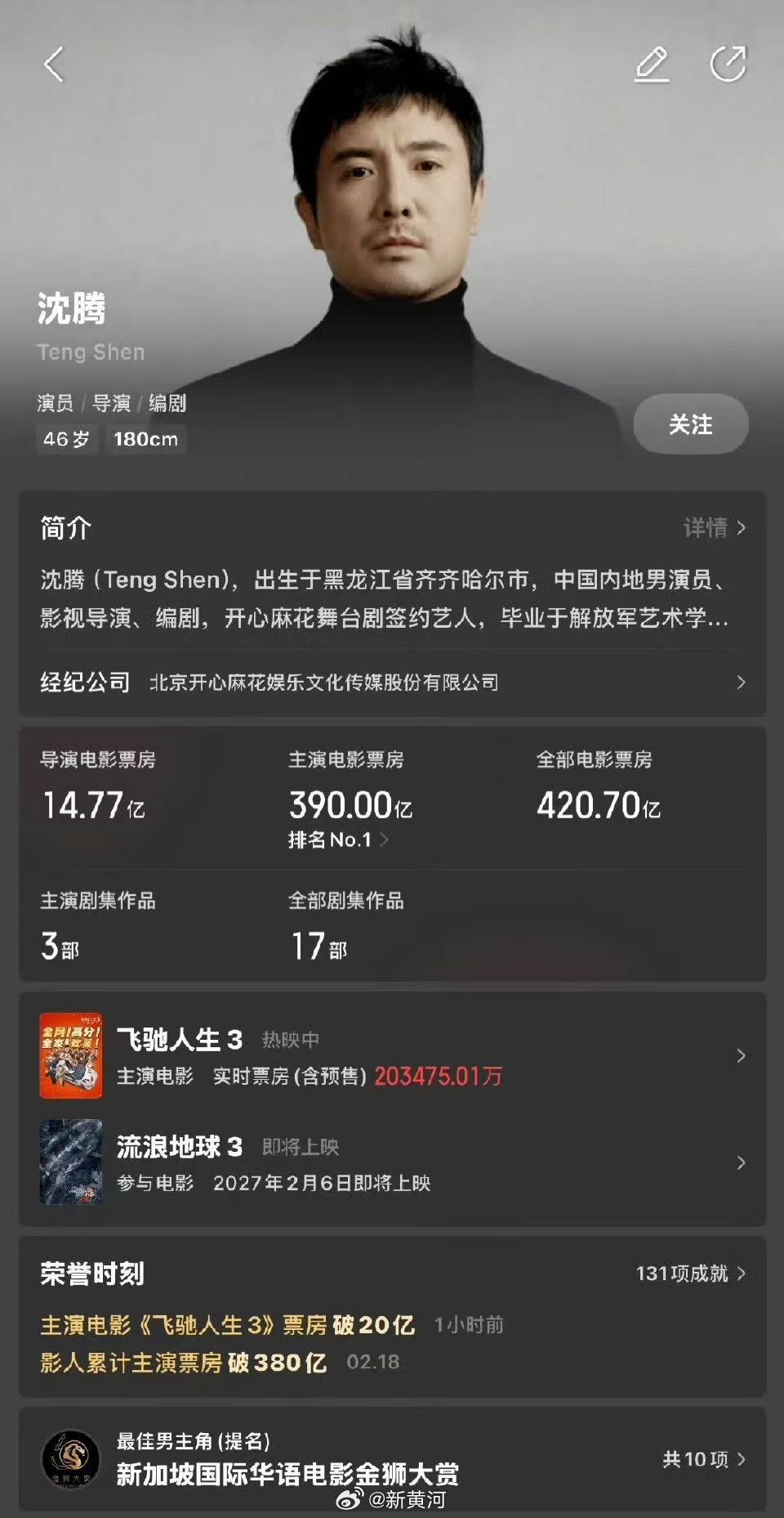 值得一提的是,沈腾仅用29部主演作品达成390亿票房,单片平均票房达13.3亿元,效率优势显著。目前他以385.83亿(截至2月20日)的主演票房,领先第二名吴京(350.83亿)约35亿元。
