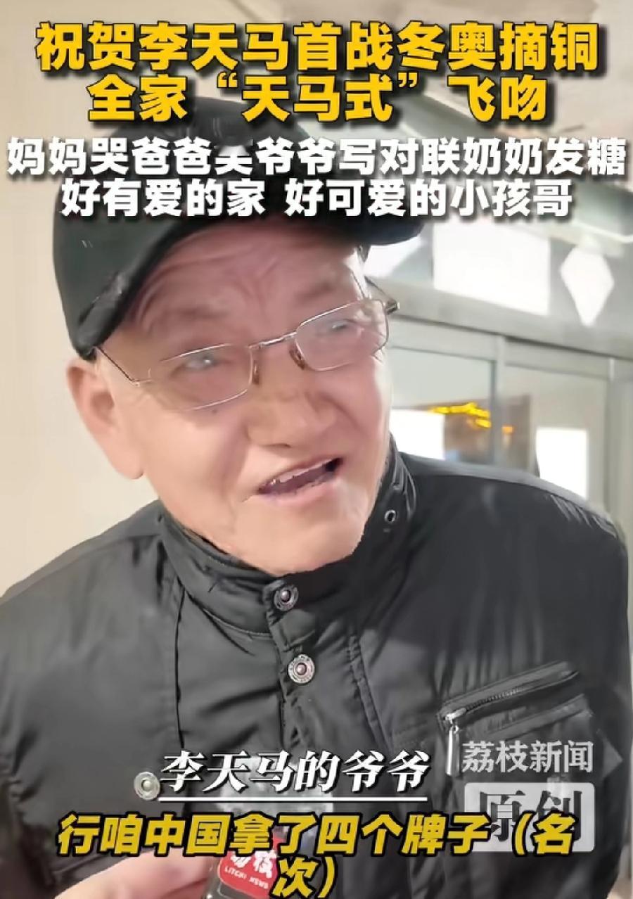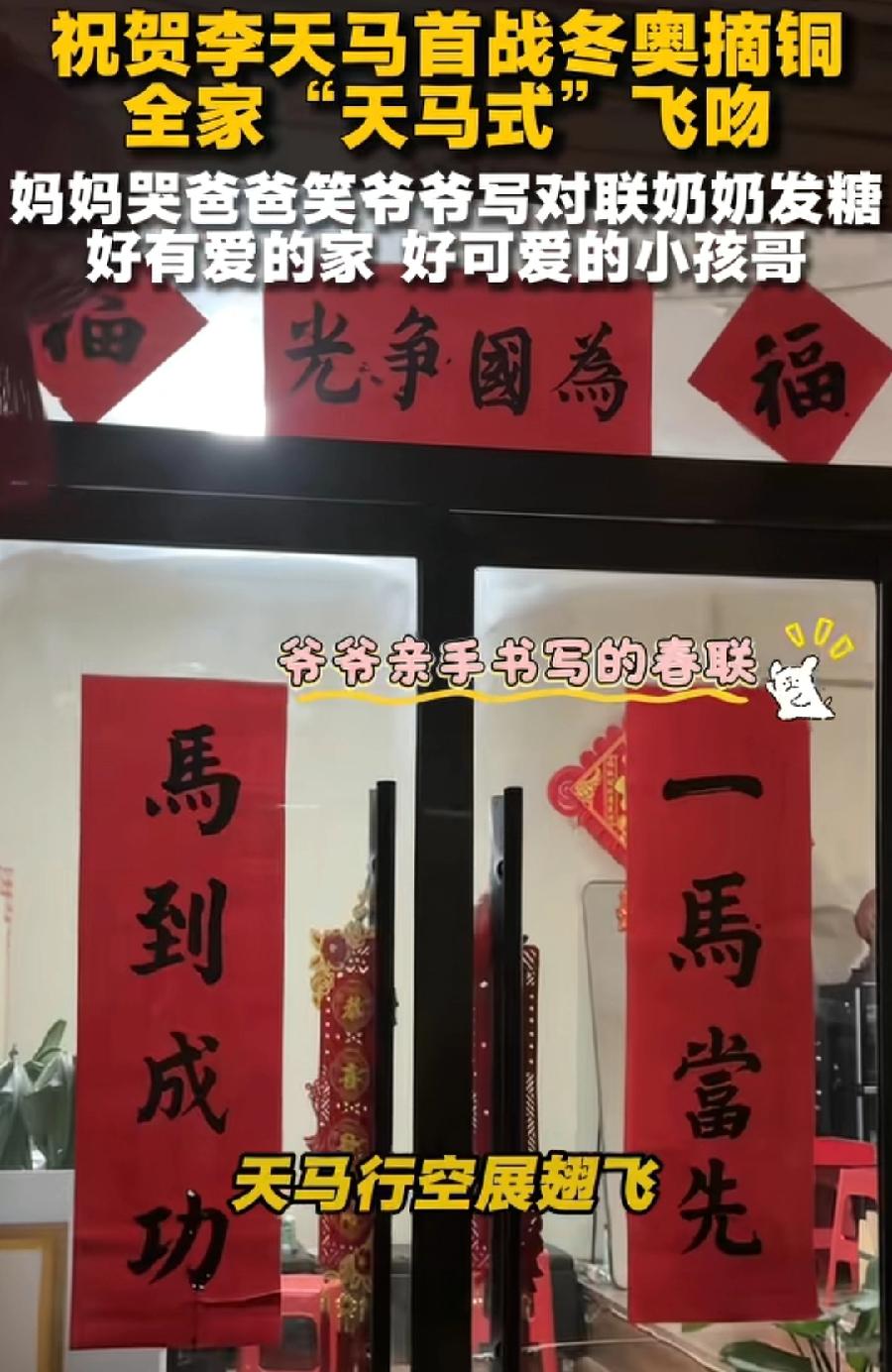 李天马的爷爷。肯定是一个文化人,不是老师,就是退休干部。名字就是爷爷起的,天马行空,第一次进奥运就夺得铜牌,马年很应景,爷爷在家当场写了一副对联一马当先、马到成功,为国争光,这书法字体,很有水平!李天马家庭,也是一个知识分子,至少中产阶级家庭,能够从事冰雪运动的确家里经济条件都不错!