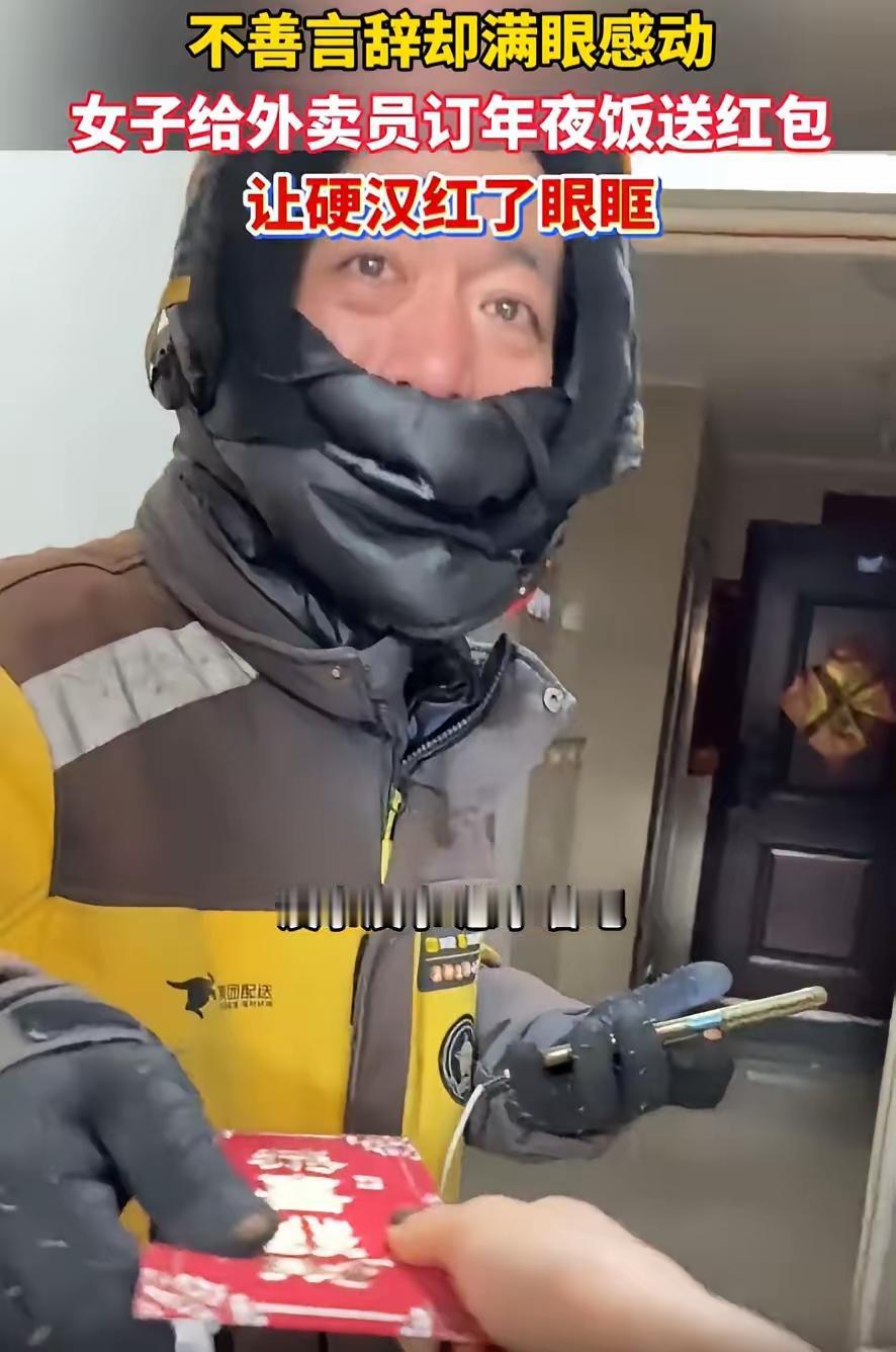 看哭了!河北邯郸,女子在除夕夜点了一份外卖,可当骑手敲门送餐时,女子却摇了摇手没接过来,反倒是和骑手说:我这是给你订的!然后还拿出一个红包送给对方,而女子的举动,也是让这位硬汉当场红了眼眶。 这事儿发生在大年三十,河北邯郸的冬夜,那叫一个冷,风呼呼地吹,街上没几个人,大多数人家,都围着桌子,吃着热乎饭,一位女士,刚和家里人,吃完年夜饭,肚子撑得慌,瘫在沙发上,手里拿着手机,漫无目的地划拉,电视里,春晚的声音,吵吵闹闹的,她突然心里一动,有个念头,冒了出来,这大过年的,还有人在外面跑吗,还有人接单吗,她下意识地,点开了外卖软件。 没想到,还真有,屏幕上,那小小的骑手图标,还亮着,那一刻,她心里,挺不是滋味,大家都在团圆,他们还在路上,鬼使神差地,她点了一份饺子,没过多久,门铃响了,骑手小哥,准时到了,他喘着粗气,把外卖递过来,脸上带着职业的笑,想赶紧送完这一单,可让他意外的是,这位女士,并没有伸手接,反而摇了摇手,往回推了一下。 小哥愣住了,手僵在半空,眼神里,全是疑惑,他大概在想,是不是送错地儿了,还是哪里做得不对,这大过年的,可别出啥岔子,就在他不知所措的时候,女士笑了,她这一笑,特别温暖,紧接着,她掏出一个红包,直接塞到了小哥手里,轻声说道:“这是给您点的,没事,拿着这个红包,新年快乐。” 这话一出,空气都安静了,小哥显然没反应过来,他看着手里的饺子,又看了看红包,嘴唇动了动,想说什么,却没说出口,女士看出了他的局促,赶紧补了几句:“没事,没事,”她反复说着这两个字,生怕这份心意,成了对方的负担,她不想让小哥觉得,这是一种施舍,而是一份,平等的礼物。 小哥的眼神,变了,从最开始的疑惑,变成了震惊,最后,化作了满满的感动,作为一个七尺男儿,在这一刻,破防了,他的眼眶,瞬间就红了,泪光在眼里打转,强忍着没掉下来,他没多说什么漂亮话,只是深深地看了一眼,默默收下了,这一刻,他收下的,不仅仅是一份饺子,更是陌生人,给的一份体谅。 说实话,这大过年的,谁不想回家,谁不想老婆孩子热炕头,肯出来跑单的,背后都有咬碎牙的坚持,或许是为了给孩子,多攒点学费,或许是想多挣两块钱,过个肥年,他们在寒风里穿梭,早已习惯了冷脸,习惯了被催促,被埋怨,突然被这么温柔地对待,心里的那道防线,一下子就崩了。 这事儿发到网上,看哭了一大片。有网友评论说: “这波善意狠狠戳中我了!除夕给骑手发红包,格局我服了!” “这骑手下去肯定边吃边哭,一个小举动就能给努力生活的人添份动力。” “我也干过这事,当时骑手愣了好久,一直说谢谢,我也跟着想哭。” 我觉得,这就是咱们中国人的温良,自己过得还行,就见不得别人苦,这点光,虽然不大,但能照亮很远的路。 世上只有一种英雄主义,那就是认清生活真相后,依然热爱生活,同样,世上只有一种温暖,是自己过得尚可时,愿意把光分给那些还在奔波的人,这位女士,用一份饺子,一个红包,给这个寒冷的除夕夜,加了一把火,生活虽苦,但总有人愿意为你缝缝补补,各位朋友,这事你怎么看,如果是你,你会这么做吗?
