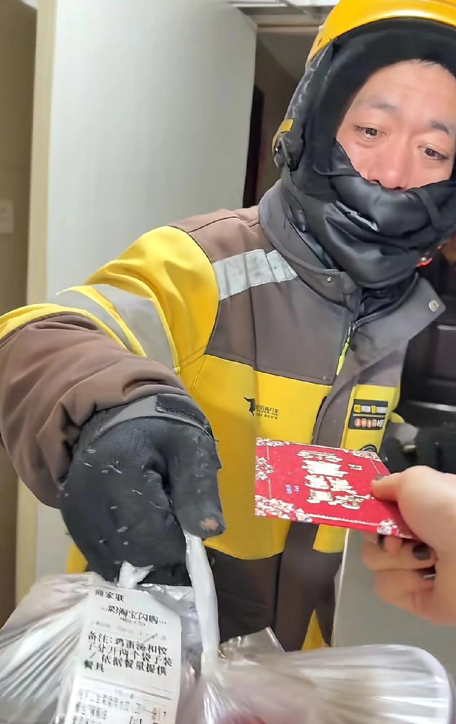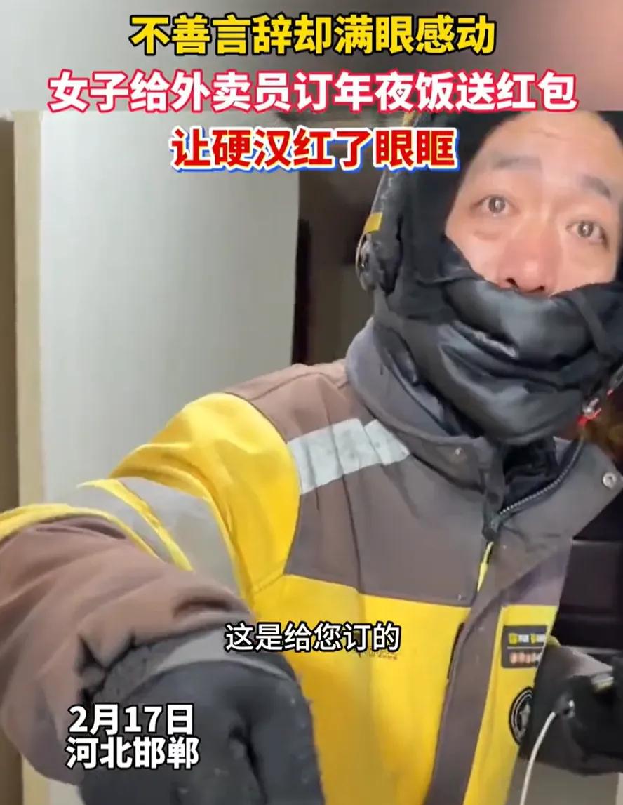 看哭了!河北邯郸,除夕夜外卖小哥接了个“特殊”的订单。顾客点的饺子和红包,不是给自己的,全是专门送给他的。这顿热饭、这份红包,让他在零下3度的寒夜里,心里暖得直泛酸。 那天是除夕,街上的年味很浓,可我还得接着跑单。接到这个订单时,我有点着急,怕超时让顾客等太久。到了小区,我赶紧上楼敲门。 门开了,我递上外卖,正等着顾客接,她却摆摆手,笑着说:“这是给您订的!”我一下子懵了,还以为自己听错了。 没等我反应过来,她又塞给我一个红包,嘴里不停地说“没事、没事,您拿着”,还嘱咐我“饺子趁热吃,路上小心,早点回家”。 我站在门口,手里拿着热乎的外卖和红包,脑子有点空。大过年的,我以为自己只是送份餐,没想到还能收到这么一份心意。眼眶不知不觉就红了,心里又暖又酸,想说句谢谢,却半天没挤出话来。 网友们说“这小哥下楼肯定一边吃一边哭”,其实我当时真的差点没忍住。平时送外卖,最怕的就是迟到被催、被投诉,有时候遇到不理解的顾客,心里挺委屈的。 可这次,顾客不仅没怪我超时,还专门给我点了年夜饭、送了红包。她反复说“没事”,我知道,她是怕我不好意思,怕我有负担。这份体谅,比红包和饺子更让我感动。 为了生活奔波。但这一刻,我觉得自己的辛苦被看见了,被尊重了。这种感觉,比赚多少钱都踏实。 跑外卖每天穿梭在大街小巷,见过很多人,也经历过不少事。有过被误解的委屈,也有过按时送达的成就感。 在这个讲求效率、人情渐淡的年代,还有人愿意为陌生人停下脚步,把“我过年了”的喜悦,分一半给“还没到家”的人。这种体谅,比任何华丽的祝福都珍贵。 在我看来善良从来不是一场“施与受”的交易,而是一场“你和我”的共鸣。 姑娘把饺子递出去时,她收获的是帮助别人的踏实;骑手接过红包时,他得到的是继续咬牙前行的暖意;而我们这些看客,在点赞和转发的那一刻,心里也种下了一颗“下次我也这么做”的种子。 世上最暖的光,从来不在天上,而在普通人看向普通人的那个眼神里。 下次如果你在街头看见那些还在奔波的身影,别犹豫,哪怕只是一个微笑,一句“辛苦了”,也许就能成为别人心里那盏过年的灯。