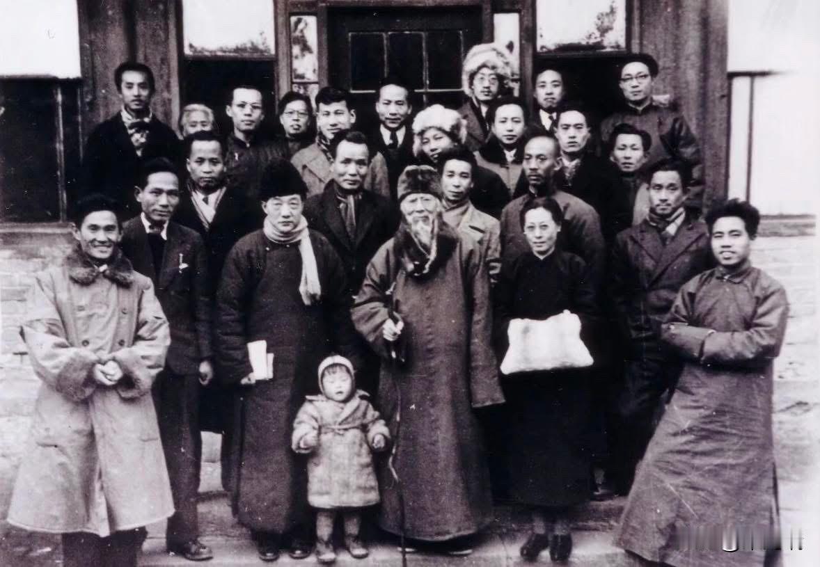 这张照片是1946年10月,国立北平艺术专科学校(现中央美术学院前身)部分教职员在洋溢胡同14号外的合影。 核心人物与背景 照片中央显著位置的是两位中国近现代美术史上的泰斗: 齐白石:画面中心留有长须的长者,当时已是享誉中外的国画大师。 徐悲鸿:站在齐白石左侧(观众视角的左方),戴着围巾并手持书籍。 其他重要信息 拍摄地点:北京东城区洋溢胡同14号(北平美术作家协会所在地)。 历史意义:1946年,徐悲鸿应邀出任国立北平艺专校长,并延请齐白石等名家任教。 照片中的其他人:前排左起包括宋步云、王乙等人。这张合影定格了当时北平美术界同仁的珍贵瞬间。