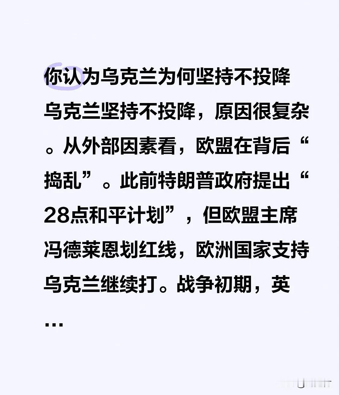 你认为乌克兰为何坚持不投降 你认为乌克兰为何坚持不投降?其原因颇为复杂。从外部因素看,欧盟在背后“使绊子”。此前特朗普政府提出“28点和平计划”,但欧盟主席冯德莱恩划定红线,欧洲国家支持乌克兰继续作战。战争初期,英国首相约翰逊从中作梗,致使乌克兰撕毁和谈协议。 内部方面,乌克兰因资源诱人而陷入各方博弈,其稀土、锂等重要资源储量丰富。美国和欧盟投入大量资金援助乌克兰,不过部分资金回流至军工企业。泽连斯基也有苦衷,他的民调支持率下滑,若答应俄方条件,怕被指责投降,从而失去盟友和政治前途。所以乌克兰宛如被各方操控的棋子,难以轻易投降。 乌现状 乌克兰局势