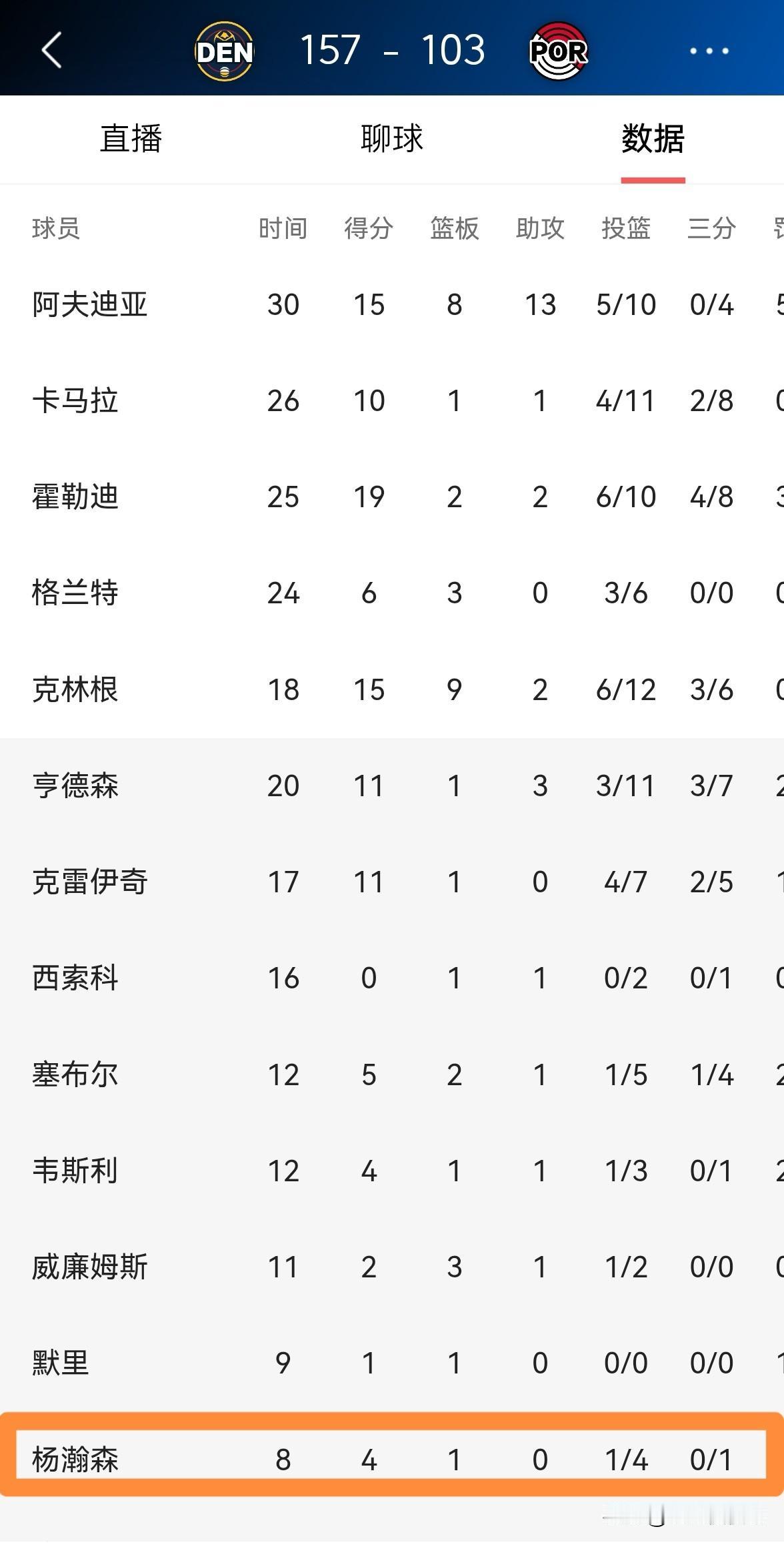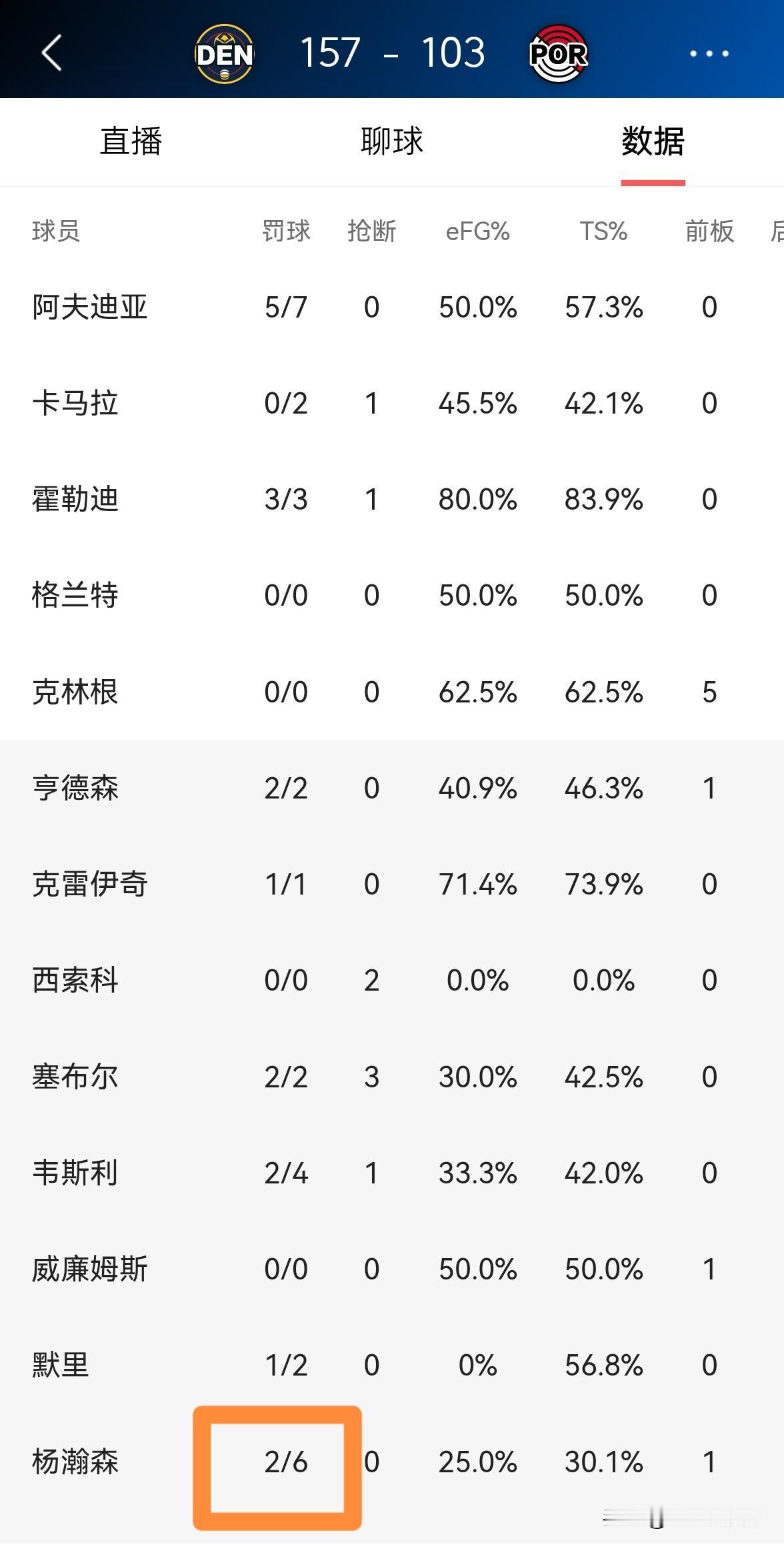 开拓者新星杨瀚森的罚球真是太让人失望了!在今天开拓者主场以103:157惨败于掘金的比赛中,杨瀚森的罚球命中率真是低的可怜。 全场比赛下来,杨瀚森替补出战8分钟,投篮4中1,其中三分球1中0、罚球6中2非常低效的得到4分,还有1次失误,他的场上正负值为-12。 作为一名中锋,杨瀚森的罚球命中率仅有33.3%,这样的表现真是让人大失所望。