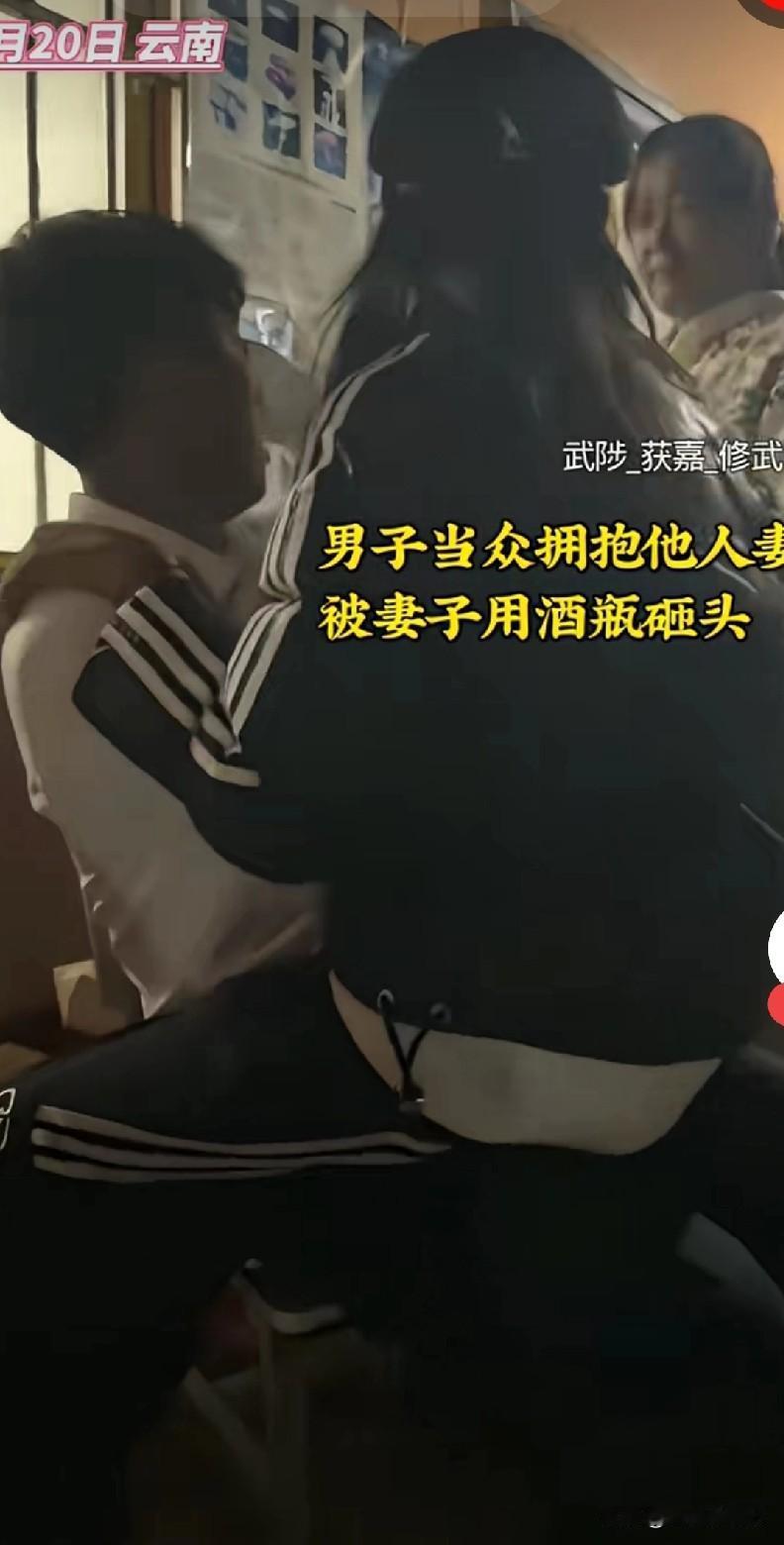 两个都有婚姻的男女,居然在聚会的时候,就喝了点小酒开始肆无忌惮的抱了起来,男人的妻子看见,直接一个酒瓶拍在了丈夫头上,只是太轻了,全网都问,老婆没吃饭吗? 这一幕发生在云南某个聚会上,巨响之下,男子当场愣住,可让人万万没想到的是,被抱在怀里的那个女人,竟然依旧一动不动,稳如泰山,仿佛什么都没发生! 这一幕被人拍下传到网上,瞬间引爆舆论。要知道,酒是穿肠药,色是刮骨刀,各自有家庭,还如此不知廉耻,被砸也是活该! 婚姻最珍贵的是忠诚,聚会最基本的是分寸。 明明都有家庭,却在公开场合放纵私欲,突破底线,既毁了自己的名声,也碎了家人的心。妻子的爆发虽极端,却也是被背叛后的绝望反击。 而那个全程一动不动的女人,更是让人大开眼界:心大到这种地步,已经不是糊涂,而是毫无底线、毫无羞耻心。 好好的家庭不懂珍惜,光明正大的日子不过,非要在酒局上放纵越界,最终落得当众出丑、家庭破裂的下场,实在是咎由自取! 也提醒所有人:酒桌上守分寸,婚姻里守忠诚,别让一时糊涂,毁掉一生安稳! (图片来自网络视频)