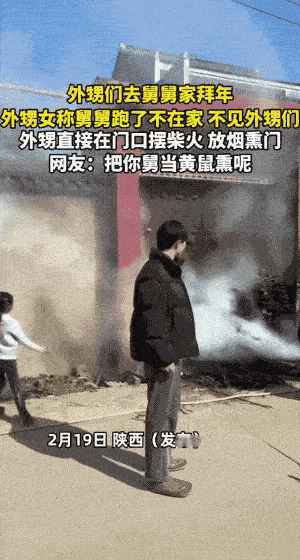 这下知道舅舅出门的原因了!陕西,一位舅舅为了躲避外甥和外甥女们前来拜年,直接紧闭大门外出旅游,没想到,外甥们来到后发现关着门,竟然在门口摆柴火烧起烟来,网友:这是把你舅当黄鼠熏呢? 大年初二,这位舅舅早早收拾行李出门旅游去了。没想到外甥们来了见门锁着,直接抱来一堆柴火,在门口点起了火 滚滚浓烟把白墙熏成了黑墙,红门烤得乌黑,这阵仗把邻居都看愣了。外甥女还掏出手机拍视频发网上,配文说舅舅跑了不见他们 说起来这事还真有意思。往年都是外甥们去舅舅家拜年,舅舅给压岁钱,热热闹闹吃顿饭。今年倒好,舅舅提前跑了,外甥们扑了个空。按理说没见着人就算了,改天再来也行。但这群外甥不干了,抱来柴火就烧,愣是把舅舅家大门口搞得乌烟瘴气。这操作属实让人没想到 对此,有网友说:开始还觉得舅舅做得不对,但看外甥们举动,突然明白舅舅为什么走了 说起来,外甥们在门口放火这事,往小了说是调皮捣蛋,往大了说就是没大没小。舅舅再怎么样也是长辈,就算不给红包也不能这样闹。再说了,过年图的是个团圆,讲究的是个心意。把舅舅家门给熏黑了,这年还怎么过? 有人说这是代沟,老一辈讲究礼数,年轻人讲究实在。但礼数和实在不冲突,关键是要互相体谅。舅舅心疼钱可以理解,外甥们想要红包也没错。但拜年不是买卖,这些晚辈做的确实不妥