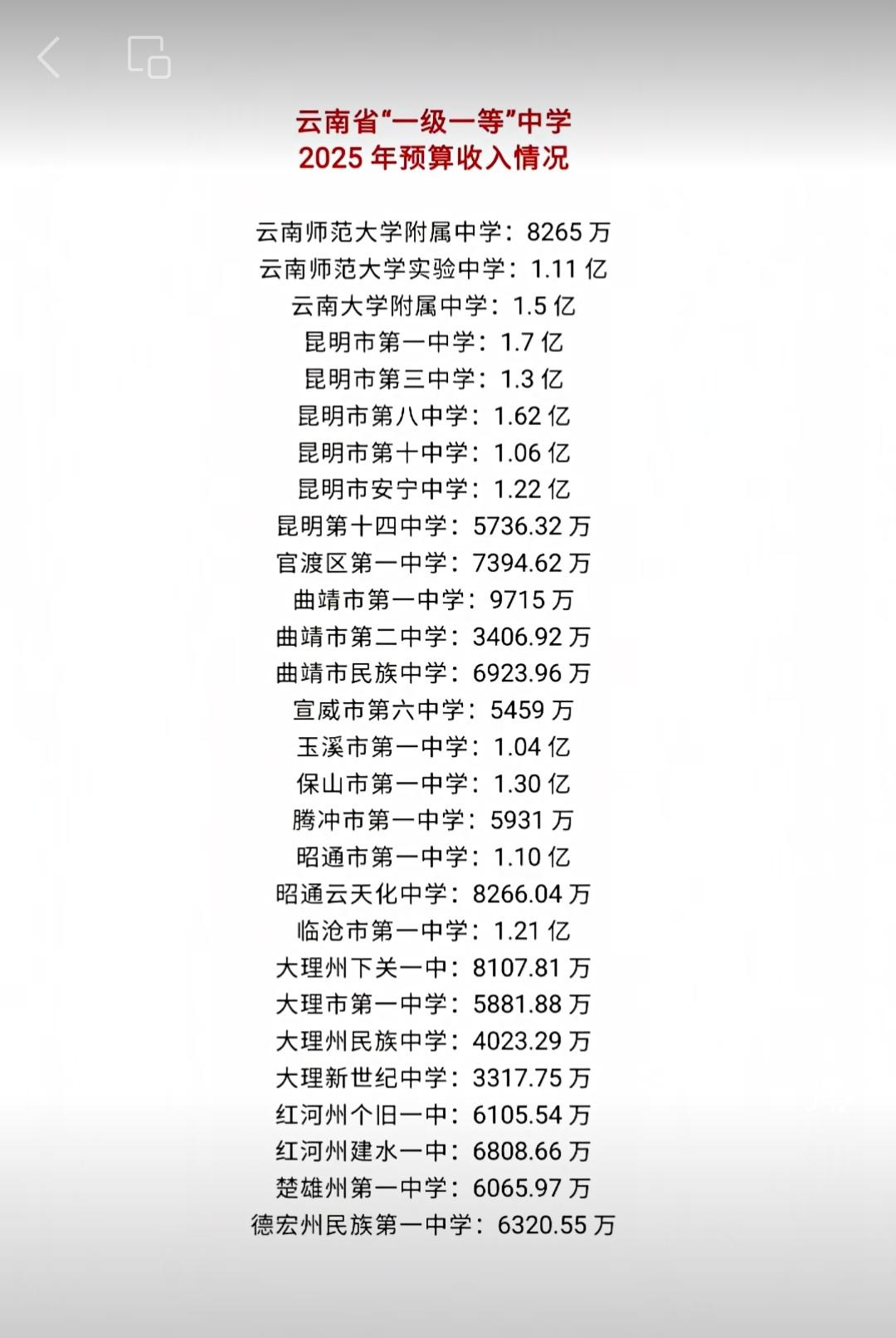 2025年云南“一级一等”中学的预算收入情况值得关注。 像云南省镇康县第一中学,在2025年3月29日进行了预算公开,其公开目录涵盖基本职能、收支情况、专项转移支付、“三公”经费等多方面。 此外,西双版纳傣族自治州第一中学在2025年2月20日公开预算,同样包含职能、收支、采购等内容。这些公开信息让我们能了解学校资金的来源与去向,也反映出教育资源的分配情况。不同学校的预算差异,或许也会影响到教学质量和学校发展,期待这些学校能合理利用资金,提升教育水平。 云南高中排行 云南初升高择校 三公经费 云南中学 云南重点学校
