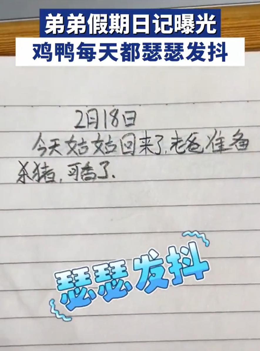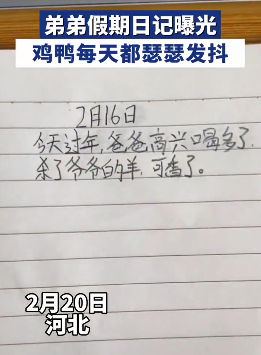 笑不活了!河北,男子回家过年,偶然在桌面上看到弟弟的假期日记,开始还好奇刚上小学的孩子能写什么,结果打开一看直接笑了,里面不是杀鸡就是杀鸭,天天都在吃。网友:这哪是假期日记,这分明是屠夫日记 翻开第一页,2月14日,平平无奇。2月15日,爸爸杀了一只鸡,可香了。2月16日,今天过年爸爸喝多了,把爷爷的羊杀了,可香了。2月17日,爸爸杀了一只鸭,可香了。2月18日,姑姑要回来,爸爸准备杀猪,可香了 短短几行字,愣是让我看到了一只鸡一只鸭一头羊和一头猪的悲惨命运。孩子笔下没有华丽的辞藻,没有深刻的感悟,只有最朴实的记录,今天杀了什么,吃着可香了 有网友说:这不就是舌尖上的春节嘛 确实如此,从这几行歪歪扭扭的字,脑子里却浮现出一幅热闹的画面:院子里堆着柴火,灶房里冒着热气,爸爸系着围裙忙里忙外,妈妈在厨房炸丸子蒸馒头,孩子们在院子里追逐打闹,偶尔跑到灶台边偷吃刚出锅的肉 孩子的日记火了之后,有人担心会不会教坏小朋友,有人调侃这孩子以后是不是要子承父业 我倒觉得,不必想太多。对于刚上小学的孩子来说,过年就是杀鸡杀鸭杀猪,就是吃好吃的,就是一家人在一起。他把最真实的感受写下来,没有矫揉造作,没有堆砌辞藻,这种纯粹的记录,反而比那些套话作文珍贵得多 弟弟假期日记曝光 鸡鸭每天瑟瑟发抖