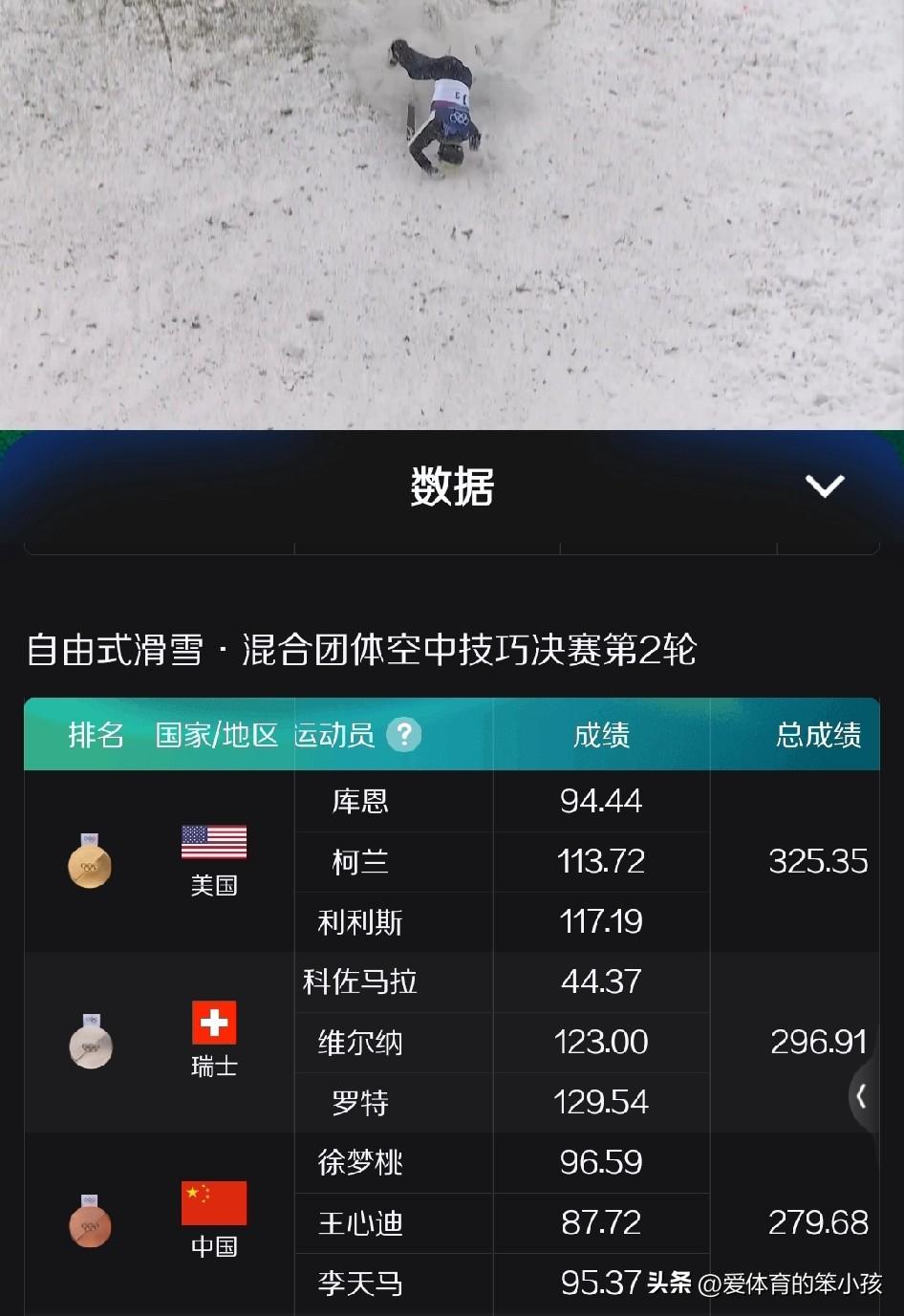 米兰冬奥会的赛场上,这个傍晚迎来了自由式滑雪空中技巧混合团体赛的比拼。而在前面的半决赛当中,4支表现稳健的团队瑞士队、澳大利亚队、中国队和美国队晋级了最后的决赛争夺轮,这4支团队当中也将产生最后的冠亚季军。 而按照出场位次,瑞士队率先登场,之后是澳大利亚队和中国队的第一位选手依次出战。美国队则作为前面半决赛当中成绩最好的团队最后一个登场。结果前面的两位瑞士选手和澳大利亚选手,也就是科佐马拉还有威尔科克斯都出现了失误,得分双双偏低。徐梦桃则以96.59分的得分在首轮的比拼当中排名第一位,美国选手库恩是拿到94.44分的得分,比徐梦桃只落后2.15分。因此后面的第二跳和第三跳就显得相当关键。 而来到第二跳的比拼当中 瑞士队的维尔纳依然是率先登场,拿到了123分的高分。而澳大利亚的斯科特第二个出战,也贡献95.30的高分,中国选手王心迪则在这一跳当中出现了速度不够导致落地不稳直接前滚翻摔倒的情况,只拿到87.72的得分。而美国选手柯兰则看到前面对手的表现之后,更改了动作难度,以稳为主还是收到不错的效果。柯蓝的动作也是收获113.72分的稳定得分,这帮助美国队在第二轮过后,占据了积分榜的榜首位置,总得分也来到208.16分。而中国队位列第二,总得分184.31分。美国队的得分超出中国队接近24分。 对于每支团队来说,显然两轮比拼过后,第三轮的比拼显得相当重要,也将决定最后的冠亚季军的归属。瑞士选手罗特率先登场,并贡献了129.54分的高分。后面登场的中国队的李天马和澳大利亚的弗拉纳甘则各自出现一些失误,拿分别得到95.37分和95.88分。而最后登场的美国队的利利斯则始终保持稳定性,拿到117.19分的高分,也力助美国队三位选手在所有登场所做的两轮动作当中无一出现失误。他们最终获得了325.35分的总分,帮助美国队成功锁定混合团体空中技巧赛的冠军。 另外,瑞士队也实现后来居上,以296.91分的总分拿到亚军。中国队则因为连续失误,拿到279.68分的总得分,收获一枚铜牌。虽然有遗憾,但是我们还是要恭喜一下中国队锁定一枚宝贵的铜牌。过于想拿好成绩影响了两位男选手的发挥,也让他们的得分和个人赛时有一定差距,但三人都能在前面个人赛登上领奖台的情况下,继续有奖牌进账,这对中国空中技巧队来说,也是一种成功,同样值得点赞。您觉得吗?