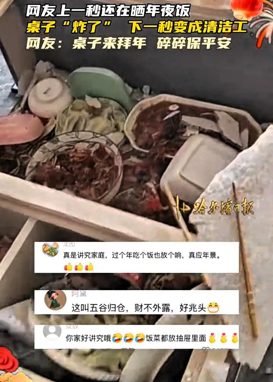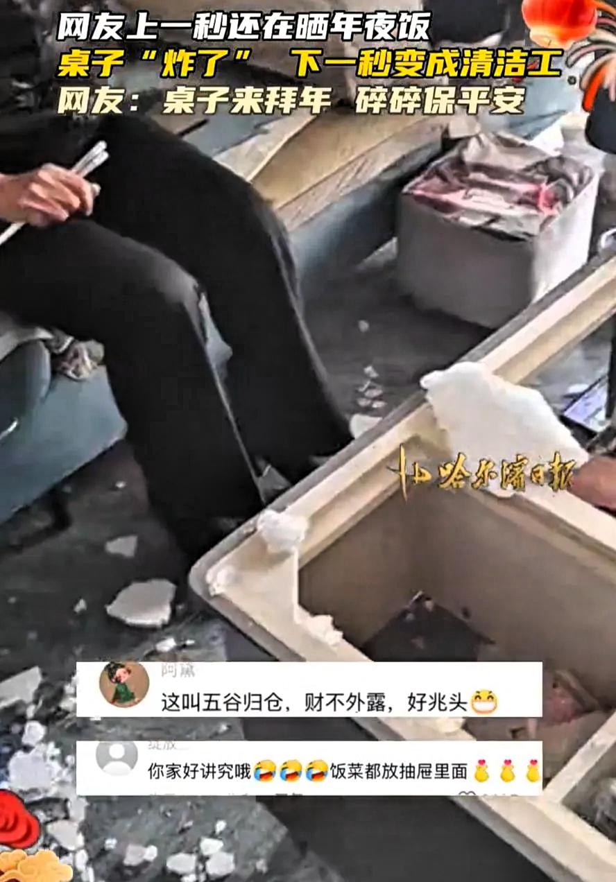 万万没想到!黑龙江,女子家里做了一桌的年夜饭,放到茶几上一口都没舍得吃,就想着先拍个照发朋友圈 好不容易拍好照片,她刚招呼家人开饭,茶几的玻璃突然开裂,紧接着整体塌陷。桌上的饭菜和餐具纷纷掉落,一桌子辛苦准备的年夜饭,就这样全部洒落在地。 看到这番情景,女子心里十分自责,觉得是自己忙着拍照才引发了意外。家人没有责怪她,反而纷纷安慰。父亲说碎碎平安,是好兆头,母亲也劝她不要放在心上,菜没了可以再做,人平安就好。 一家人很快收拾好现场,重新走进厨房。没有了之前丰盛的摆盘,大家简单煮了饺子,配上几个家常小菜,围坐在一起吃饭。虽然饭菜普通,可气氛依旧温馨,一家人说说笑笑,和和美美。 这件小事也让很多人有所感触。现在过年,大家常常会习惯性地拍照记录,希望留住团圆的瞬间,这本是很正常的事。但很多时候,我们也容易在意外在的形式,忽略了过年最本质的意义。 年夜饭的价值,不在于菜品多丰盛,照片多好看,而在于一家人能聚在一起,彼此体谅,互相温暖。日子过得踏实安稳,家人平安健康,比任何精致的场面都更重要。 生活里难免出现小意外,可正是这些不完美,让团圆显得更加珍贵。平淡真实的陪伴,才是过年最好的模样。