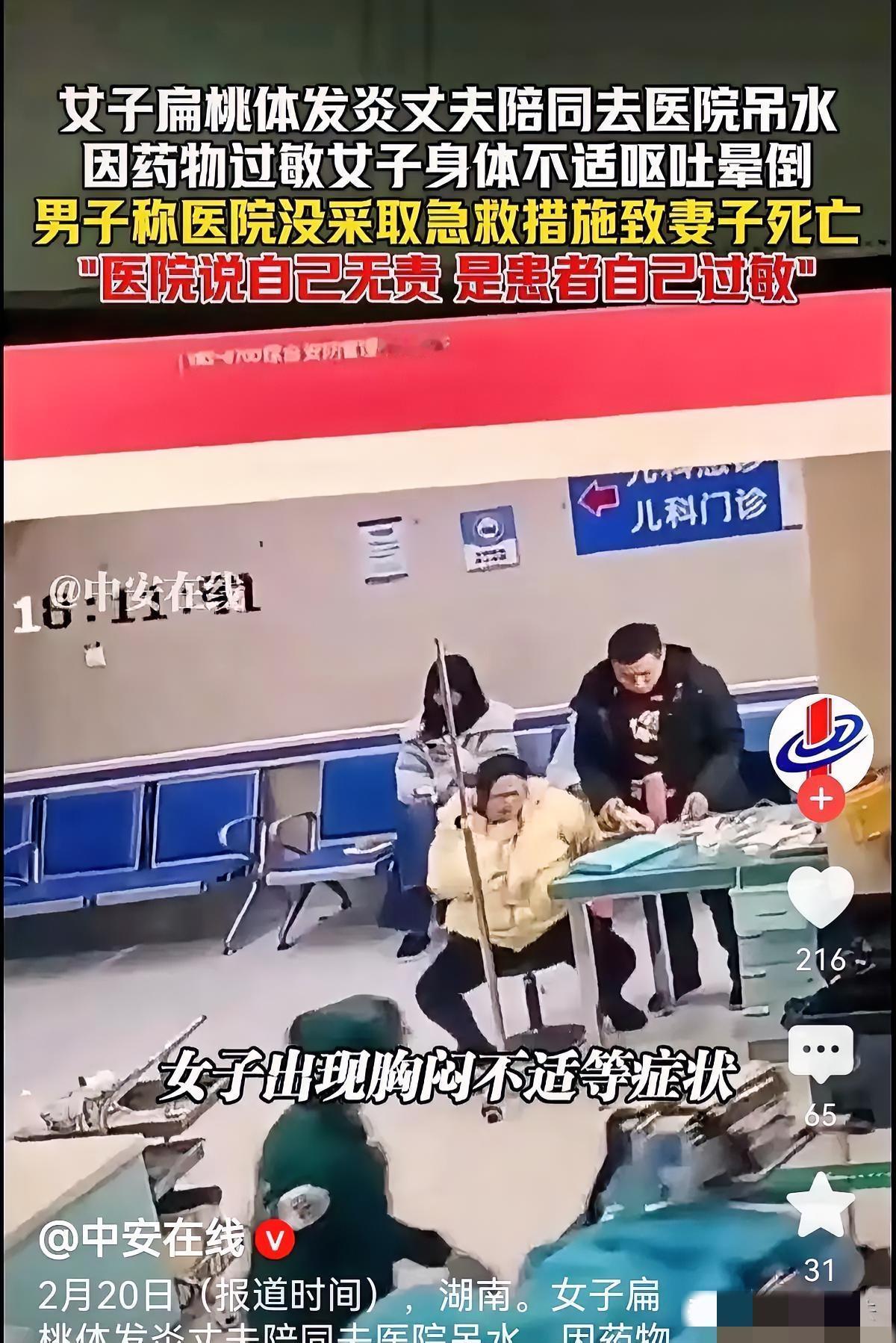 湖南益阳,女子扁桃体发炎,丈夫陪同去医院吊水,仅打了4秒钟,女子开始有呕吐、胸闷的症状,有护士来查看很快离开。丈夫大喊护士过来帮忙,这才推开担架,然而,女子抢救无效死亡。丈夫认为错过黄金救援4分钟,医院未采取急救措施存在责任,而医院说说自己无责,是女子自己过敏,不让见尸体,要求签11万人道主义赔偿! 这件事听起来就让人心里发沉,谁也不会想到,一个小小的扁桃体发炎,竟然能夺走一条人命。 扁桃体发炎算是很常见的小毛病了,平时很多人扛一扛或者输个液就好了,所以当时女子和她丈夫也没当回事,丈夫陪着她去医院吊水,估计也只是想着输完液就能回家,没料到这一去就再也没能回来。 据了解,当时护士给女子扎上针,药液刚输了4秒钟,女子就出现了异常,开始呕吐、胸闷,看得出来非常难受。 这时候有护士过来查看了一下,但没多做停留,很快就转身离开了,没有采取任何应急措施。 一旁的丈夫瞬间就慌了神,看着妻子难受得说不出话,只能拼命大喊护士过来帮忙,喊了好一阵子,才有人才推着担架慢悠悠过来,可这时候已经耽误了最关键的时间,最终女子还是抢救无效,没了性命。 事后,丈夫心里又痛又气,他觉得,妻子出现过敏症状后,医学上公认的黄金救援时间是4分钟,在这4分钟里,如果医院能及时采取急救措施,比如注射肾上腺素,妻子或许就有生还的可能,可医院却在这段关键时间里毫无作为,明显存在责任。 可医院那边的态度却让人难以接受,他们一口咬定自己没有任何责任,说女子的死亡是因为她自身是过敏体质,和医院的诊疗操作没有关系。 更让丈夫无法接受的是,医院还不让他见妻子的尸体,只给出了一个11万人道主义赔偿的方案,要求他签字,相当于想用这11万就了结这件事,把一条人命轻飘飘地打发了。 其实不管是谁,遇到这样的事都没法接受,好好的一个人,因为小毛病去医院,结果却送了命,医院不仅不承认过错,还百般推诿,甚至不让家属见亲人最后一面。 毕竟输液前,医护人员本该询问过敏史、评估过敏风险,就算是不需要常规皮试的药物,也该做好应急准备,可这些流程显然都没有做到位。 现在相关部门已经介入调查,具体的责任划分还得等官方的结论,但这件事也让人不得不深思,医院本是守护生命的地方,医护人员的每一个疏忽,都可能酿成无法挽回的悲剧。 一条鲜活的生命,不是11万就能衡量的,家属想要的也从来不是赔偿,而是一个公道,是医院对过错的承认和反思。 大家对此怎么看?欢迎评论区留下您的观点!