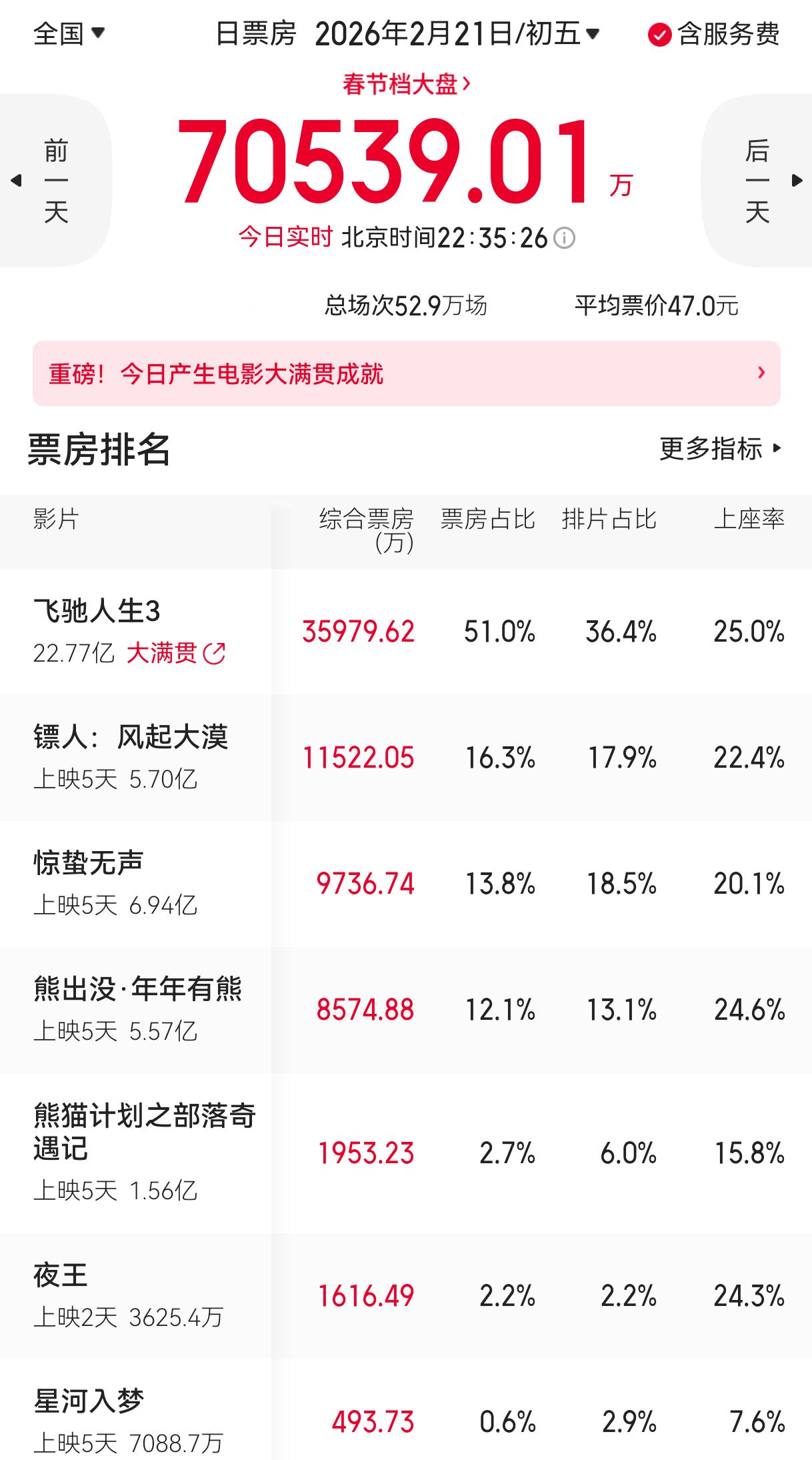 报!《飞驰人生3》在排片场次每天都在降低的情况下依然保持着春节档电影该有的样子,今天单日票房依然在3.5亿以上,继续一穿五,依然是唯一一部票房占比和排片占比正挂的春节档电影!上座率25%也是第一名!争气争气太争气