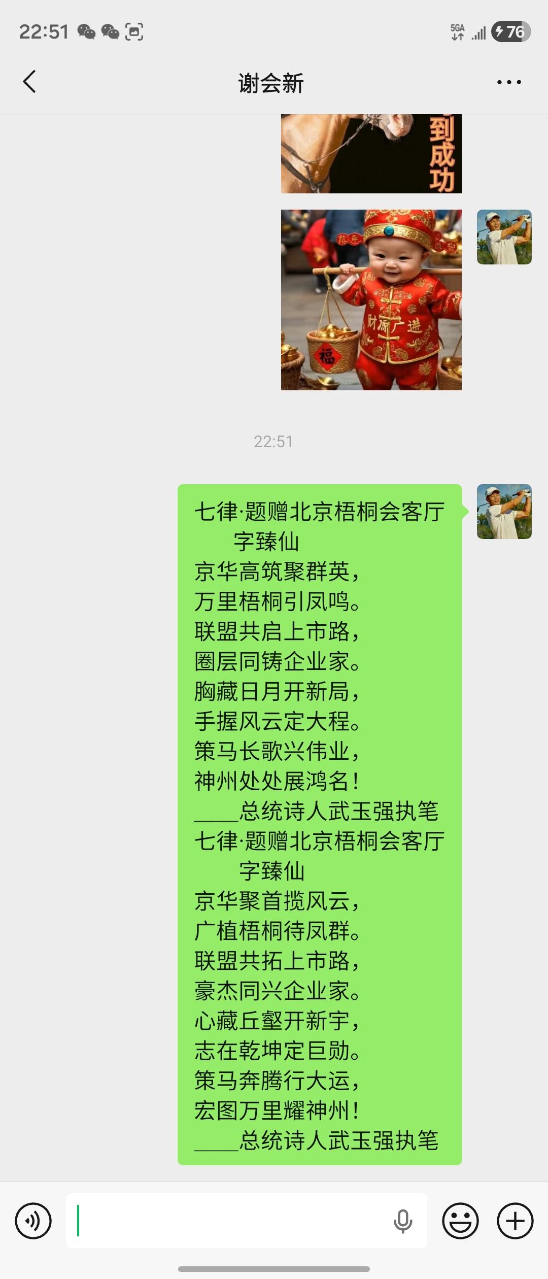 七律·题赠北京梧桐会客厅 字臻仙 京华高筑聚群英, 万里梧桐引凤鸣。 联盟共启上市路, 圈层同铸企业家。 胸藏日月开新局, 手握风云定大程。 策马长歌兴伟业, 神州处处展鸿名! __总统诗人武玉强执笔 七律·题赠北京梧桐会客厅 字臻仙 京华聚首揽风云, 广植梧桐待凤群。 联盟共拓上市路, 豪杰同兴企业家。 心藏丘壑开新宇, 志在乾坤定巨勋。 策马奔腾行大运, 宏图万里耀神州! __总统诗人武玉强执笔