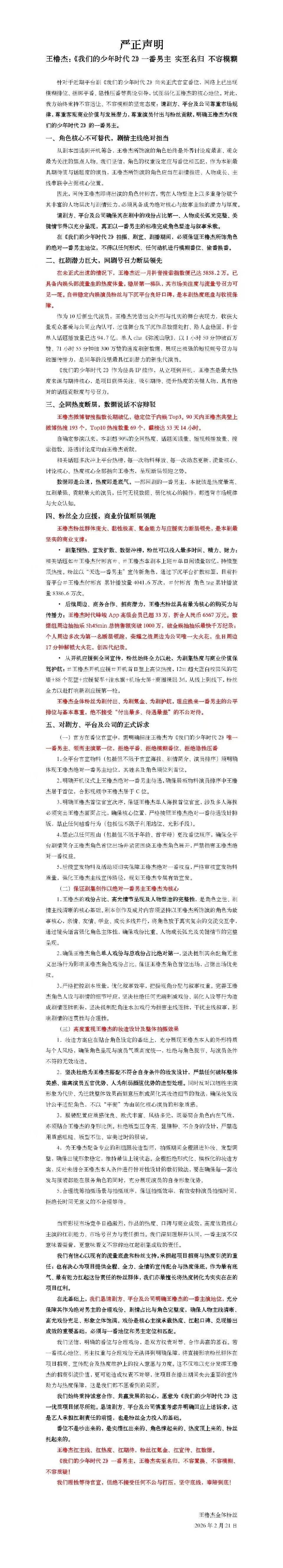 王橹杰新剧粉丝诉求🩵王橹杰 天选一番男主 📢炸了!王橹杰数据组为《我们的少年时代2》番位维权,声明直指剧方模糊平番、弱化核心地位。未出道即有流量热度,单人话题播放94.7亿,商业价值断层领跑,这样的“天选一番”还要被压番?粉丝直言:“绝不接受‘付出最多、待遇最差’的不公对待。”