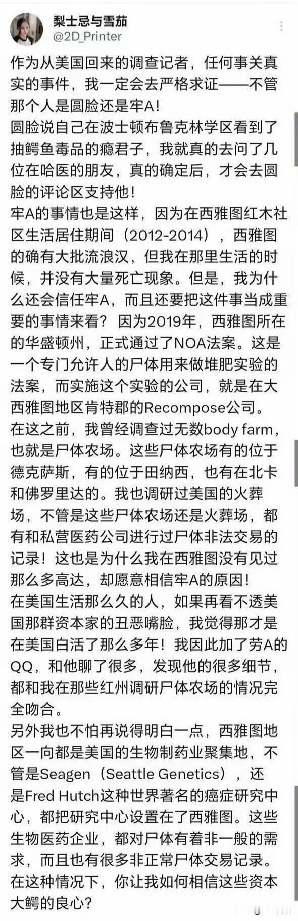 牢A说见过的很多东西,都是没法直播和讲述的。 牢A所能讲出来的,其实只是冰山一角,露出水面的小点点而已,真正掩藏在水面下的大块冰座是无法想象的。有西雅图的朋友发声佐证并信任牢A! 人类堆肥,在美国本来也是一项环保的葬法,但是对于在我们来说还真的是闻所未闻。我敢肯定,这里面还有更多的细节,等待牢A披露…… 牢A 牢a自曝