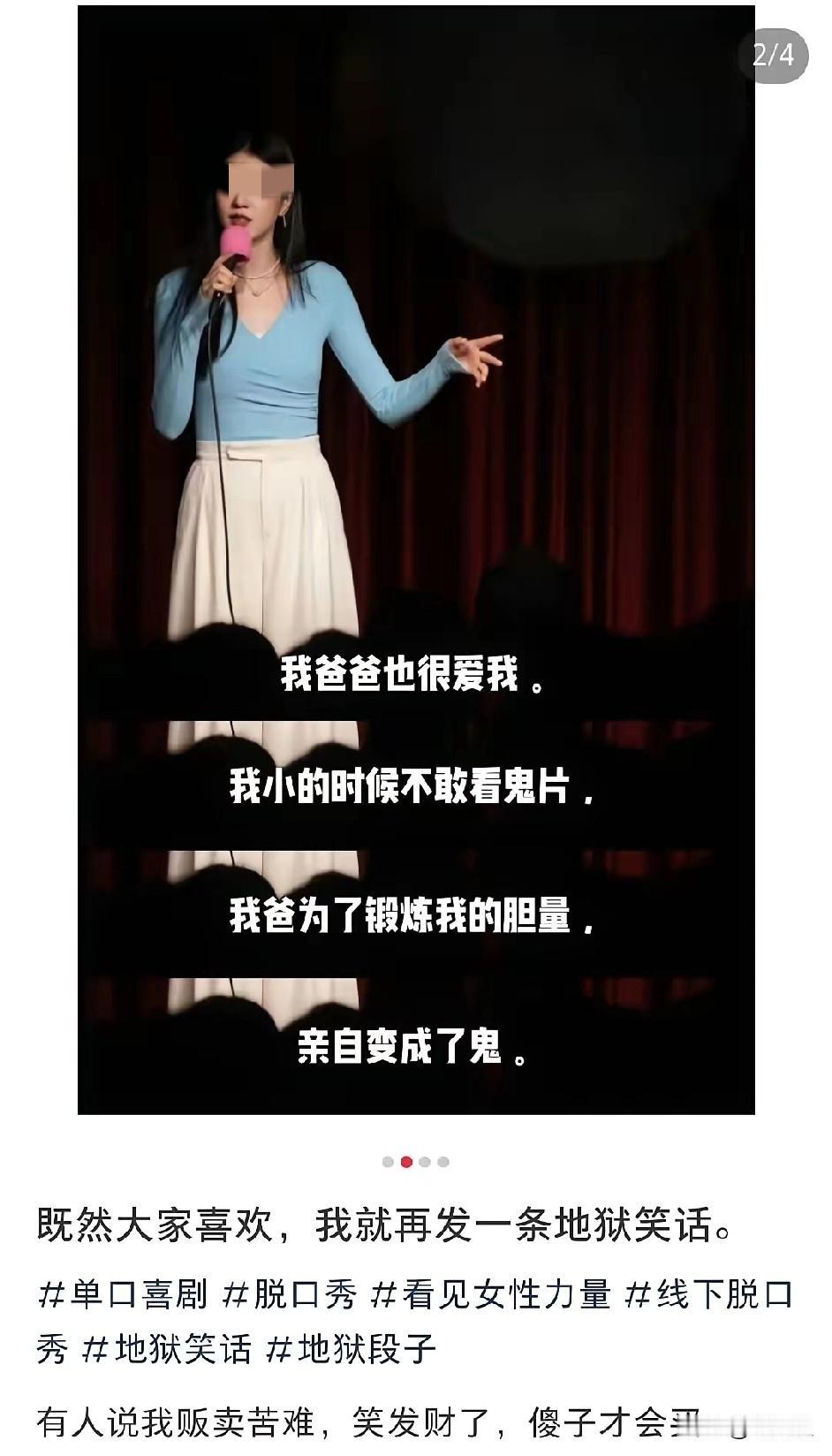 我的爸爸很爱我,从小知道我不敢看鬼片,为了锻炼我的胆量,我的爸爸亲自变成了鬼。这还能算人话吗?这完全就是鬼话。脱口秀虽然很搞笑,虽然很恶搞,但是想不到脱口秀已经没有了底线,居然会拿自己的父亲来开刷,这到底是脱口秀还是真人秀?竟然拿自己最亲的人来整了,不知道他的家人看到他女儿如此的脱口秀,会作何感想!这样的节目完全突破了常人的底线,这样的节目居然还能够开播,真不知道演讲者心里是怎么想的,也不知道这些在现场的观众是如何看待演讲者如此的演讲,作为正常人而言,谁会拿自己的父亲来开涮?谁会诅咒自己的父亲?这简直毫无底线,简直就不能称之为人。脱口秀美女人长得很漂亮,但是心里怎么如此的黑暗呢!