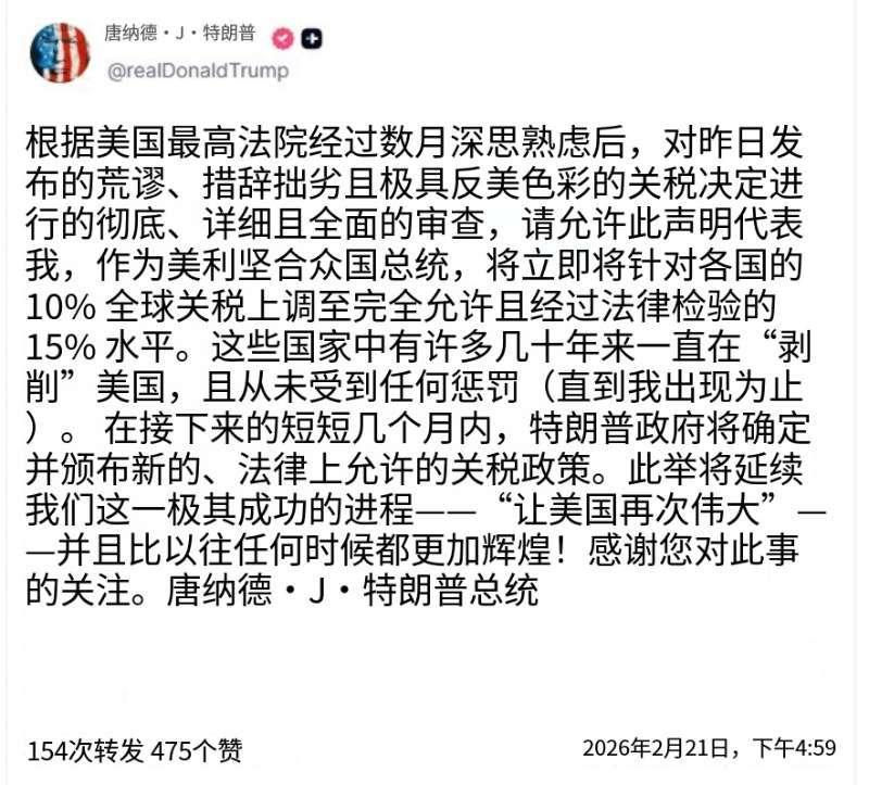 2月22日,特朗普再次在社交媒体上对世界“二度开炮”,将前一天决定的对全球的10%新关税再度提升到15%。那么如何理解特朗普的这个决定呢?他到底想做什么? 首先,从事实层面来看,特朗普宣布将此前援引1974年贸易法第122条实施的10%全球临时进口附加费(surcharge)提高至15%(立即生效),这个数字是第122条的法定上限。特朗普在Truth Social上称此为对“荒谬、反美”裁决的回应,强调许多国家“几十年来剥削美国”而未受惩罚,他上台后才得以纠正。 其次,特朗普一天之内再度加税,背后的主要原因和动机可能有三点:1是直接对抗最高法院,展示总统贸易权力的决心,避免被视为司法让步;2是“最大化”1974年贸易法第122条的150天临时窗口,在国会可能干预前尽快抬高关税壁垒,增加财政收入并施压贸易伙伴;三是延续“美国优先”叙事,通过惩罚“剥削者”提振国内制造业支持者和选民基础,强化中期选举政治资本。不过,这更多被视作象征性的“报复性升级”,而非深层经济计算,因为第122条本为短期国际收支平衡工具,非长期贸易武器。 最后,这项新政对美国的影响是双重而复杂的。从正面来看,有助于带来短期财政收入增加,部分抵消赤字,并刺激本土制造业回流,符合特朗普“让美国再次伟大”的承诺。但从负面来看,这可能会推高进口成本,消费者面临物价上涨,企业供应链受阻,尤其是依赖进口零部件的行业利润压缩。美联储可能被迫维持高利率以控通胀,加剧经济放缓风险。股市短期波动(道指可能下跌),但若引发全球报复,美国出口将受重创。 整体来看,一天内“两次向全球加税”的举动,有助于强化特朗普贸易鹰派形象,但加剧国内通胀压力和国际孤立,可能拖累2026年全年GDP增长。若150天后到期,特朗普可能转向301条款等永久工具,导致更持久的经贸对抗。中国、欧盟等已表态将评估反制措施,全球经济增长预期下调。长期看,这加速“去全球化”趋势,加剧地缘经济紧张和供应链脆弱性。