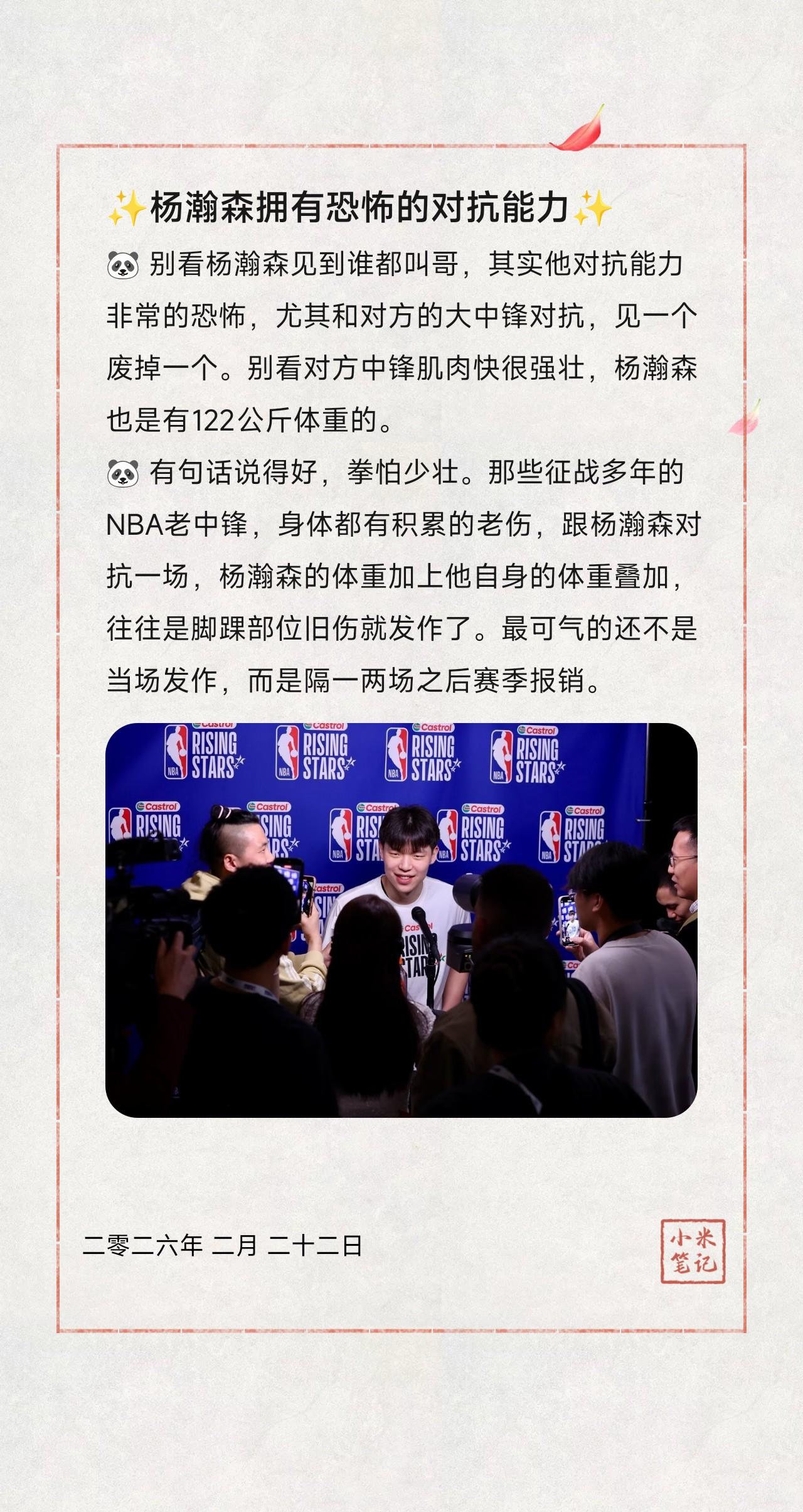 🐼 别看杨瀚森见到谁都叫哥,其实他对抗能力非常的恐怖,尤其和对方的大中锋对抗,见一个废掉一个。别看对方中锋肌肉快很强壮,杨瀚森也是有122公斤体重的。 🐼 有句话说得好,拳怕少壮。那些征战多年的NBA老中锋,身体都有积累的老伤,跟杨瀚森对抗一场,杨瀚森的体重加上他自身的体重叠加,往往是脚踝部位旧伤就发作了。最可气的还不是当场发作,而是隔一两场之后赛季报销。 🐼 其实,克林根的身子骨比杨瀚森要虚,如果两个人真的激烈对抗,杨瀚森也能够把克林根跟打得赛季报销。杨瀚森的有持球攻的技术,一个122公斤的大个子要是旋转起来,产生的动能是非常恐怖的。 🐼 还记得开拓者队打灰熊那场比赛吗?杨瀚森转身要抹过扎克伊迪,扎克伊迪硬要拦截杨瀚森,并且挥臂结结实实打在杨瀚森脸上,实际上杨瀚森旋转产生的动能全都被扎克伊迪给接住了,对扎克伊迪的腰椎和脚踝产生了巨大的冲击。 🐼 有经验的大中锋不能那样硬接这种冲击力,而是应该稍微跳着点接力,这样就被弹开了,把冲击力给卸掉了。你看约老师打球,篮下进攻的时候跟个陀螺一样的蓄力,防守的时候,宁可让开也不硬接冲起来的对方球员。 作者: 龙须面🧐