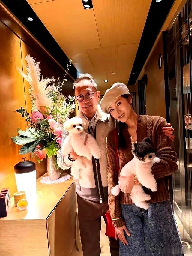 他们晒出的新年合照里,两人身着同款红色印花毛衣开衫,笑容灿烂,姿态亲昵,怀里还抱着两条狗,构成了一幅标准的、可以放进任何一本《幸福家庭样板间》教材的插图。