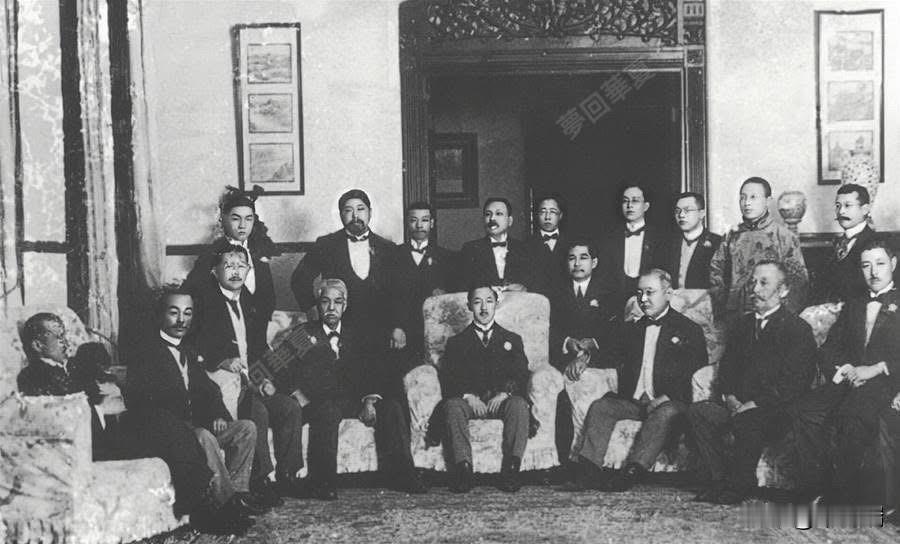 一九一三年四月下旬,国父孙中山致电各国政府和人民,劝告日本不可援助袁世凯。图为五月八日孙中山在上海设宴招待日本贵族院 议员德川公爵时合影。 后排还有几个重要的人物,从右至左.陈其美、黄兴及戴季陶