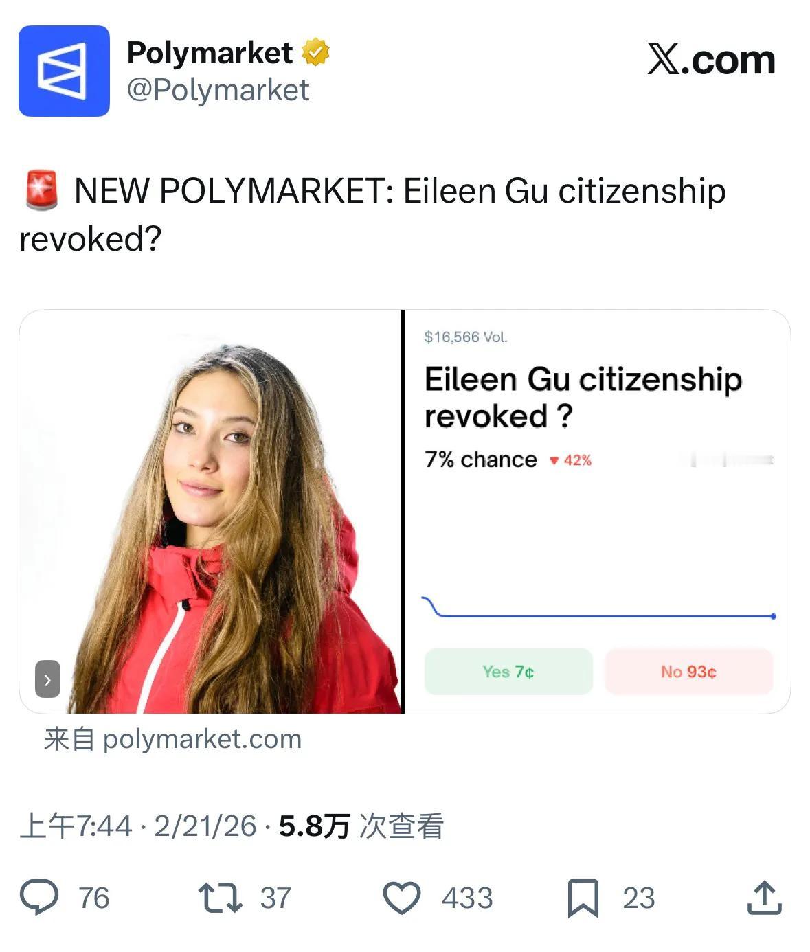 预测市场Polymarket 近日上线了新标的:谷爱凌的(美国)国籍会被撤销吗? 此事当前的成交金额为16,566美元,认为她国籍会被美国撤销的价格为7美分,认为不会的为93美分,这意味着市场认为此事发生的概率约为7% , 也就是说:市场整体判断谷爱凌被撤销美国国籍的可能性很低。 图中显示 ▼42%,说明“会被撤销”的概率较之前大幅下跌。这通常意味着:市场对此事早期有情绪炒作或舆论波动,随着事件的消化冷静,资金更多押向“No”。 Polymarket 是一个基于区块链的“预测市场”(Prediction Market)平台,用户可以用真钱下注某件事会不会发生。 老外真会玩。
