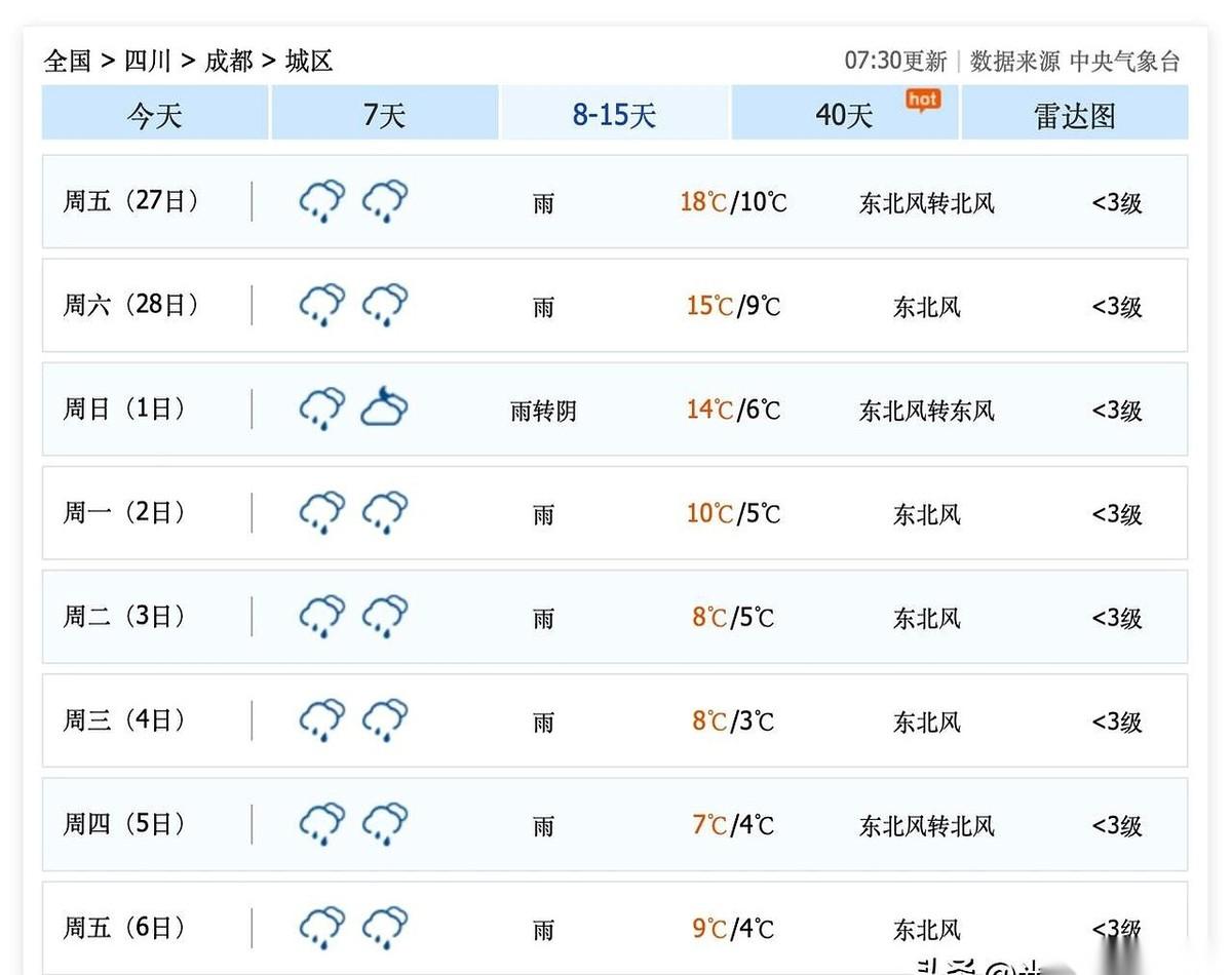 我发誓,上周我还穿着单衣在外面晃悠。 结果呢? 刚塞进压缩袋的羽绒服,昨天晚上又认命地给扒拉出来了。 成都这个天,真的,服了。 前脚刚给你一点春天的甜头,让你以为冬天过去了,后脚就一巴掌把你扇回西伯利亚。 这哪是降温,这是速冻。 而且还不是干冷,是那种湿哒哒、阴恻恻的冷,钻骨头缝的那种,纯纯的魔法攻击。 秋裤焊在腿上都不管用。 好家伙,连元宵节都不放过。 别人家团团圆圆吃汤圆看花灯,我们成都人,是裹着羽绒服,在风雨里瑟瑟发抖,思考人生。 这过的是元宵节,还是渡劫? 看了一眼天气预报,后面一长串的雨雨雨雨雨…… 行吧。 我新买的春装,你们就先在衣柜里再修炼一段时间吧。