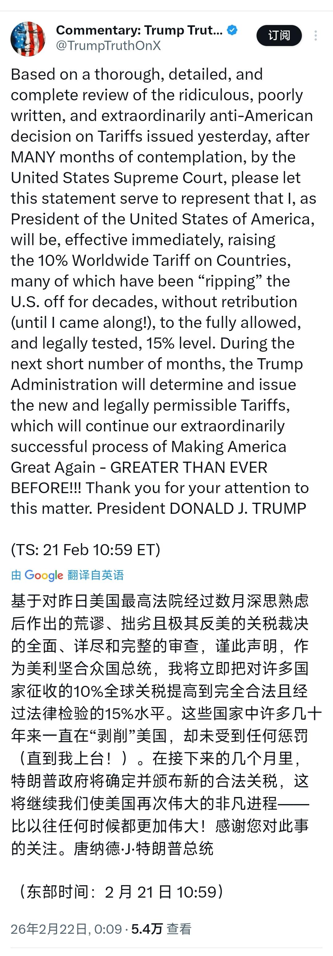 特朗普再次朝令夕改。特朗普昨晚(北京时间2月21日晚)发文写道:“基于对昨日美国最高法院经过数月深思熟虑后作出的荒谬、拙劣且极其反美的关税裁决的全面、详尽和完整的审查,谨此声明,作为美利坚合众国总统,我将立即把对许多国家征收的10%全球关税提高到完全合法且经过法律检验的15%水平。这些国家中许多几十年来一直在‘剥削’美国,却未受到任何惩罚(直到我上台!)。在接下来的几个月里,特朗普政府将确定并颁布新的合法关税,这将继续我们使美国再次伟大的非凡进程比以往任何时候都更加伟大!” [机智]评几句:特朗普最新的加税表态,绝非针对他国的理性贸易决策,纯粹是对内发泄情绪、彰显个人强硬姿态的无能狂怒。面对美国最高法院驳回其越权关税的裁决,特朗普恼羞成怒,24小时内将10%关税强行提至15%,这一数字并非基于国家利益或紧急状态,恰恰是总统行政令能触及的法定上限,说明他早已无计可施,只能在法律框架内做最后的情绪宣泄。所谓“反美裁决”“剥削美国”等说辞,全是掩盖政策失败的借口,特朗普的贸易政策朝令夕改、全凭个人心情,高兴就降、不高兴就加,毫无战略可言。这种把国家贸易工具当作个人斗气手段的做法,彻底暴露了特朗普治理能力的匮乏,所谓合法合规不过是自欺欺人,最终只会让美国民众与经济承担代价,也让全球贸易陷入不必要的混乱。