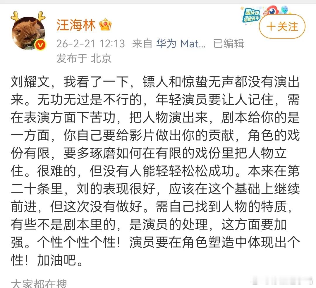 春节档电影《镖人》和《惊蛰无声》正在热播,引发了广泛关注。导演汪海林对刘耀文在这两部影片中的表现发表了看法,直言其没有演出角色的个性。汪海林表示,刘耀文在《镖人》和《惊蛰无声》中的表演未能出彩,存在无功无过的情况。他强调,年轻演员若想被观众记住,必须在表演上狠下功夫,不仅要依托剧本,更要主动为影片贡献力量。尤其在角色戏份有限的情况下,更需琢磨如何在有限空间里立住人物,毕竟成功并非易事,需要不懈努力与钻研。