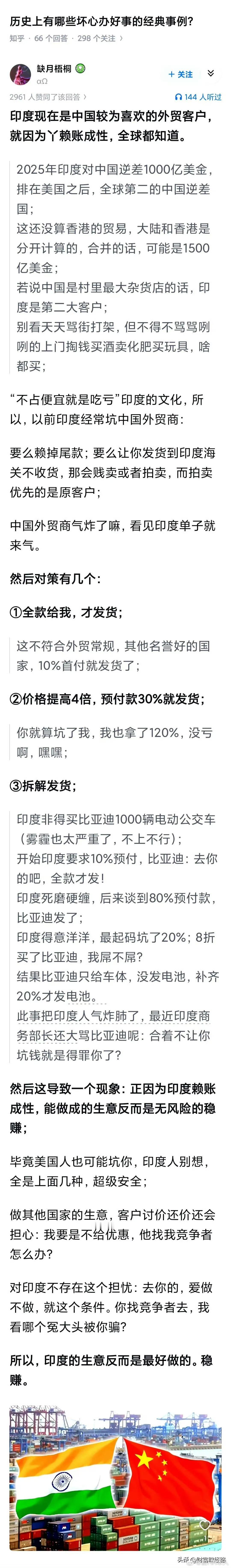 【琅河财经】印度市场为什么变成好生意了?因为客户没有信用,所以没有客户维护成本,完全公事公办,反倒省事! 商家对印度办法是三类,第一全款后发货。第二是提高价格,让预付款已经达到全款目标。第三是拆散发货,你不给钱就用不了[笑哭] 所以现在卖给印度是卖一单赚一单。蠢的是那种去印度开工厂的。
