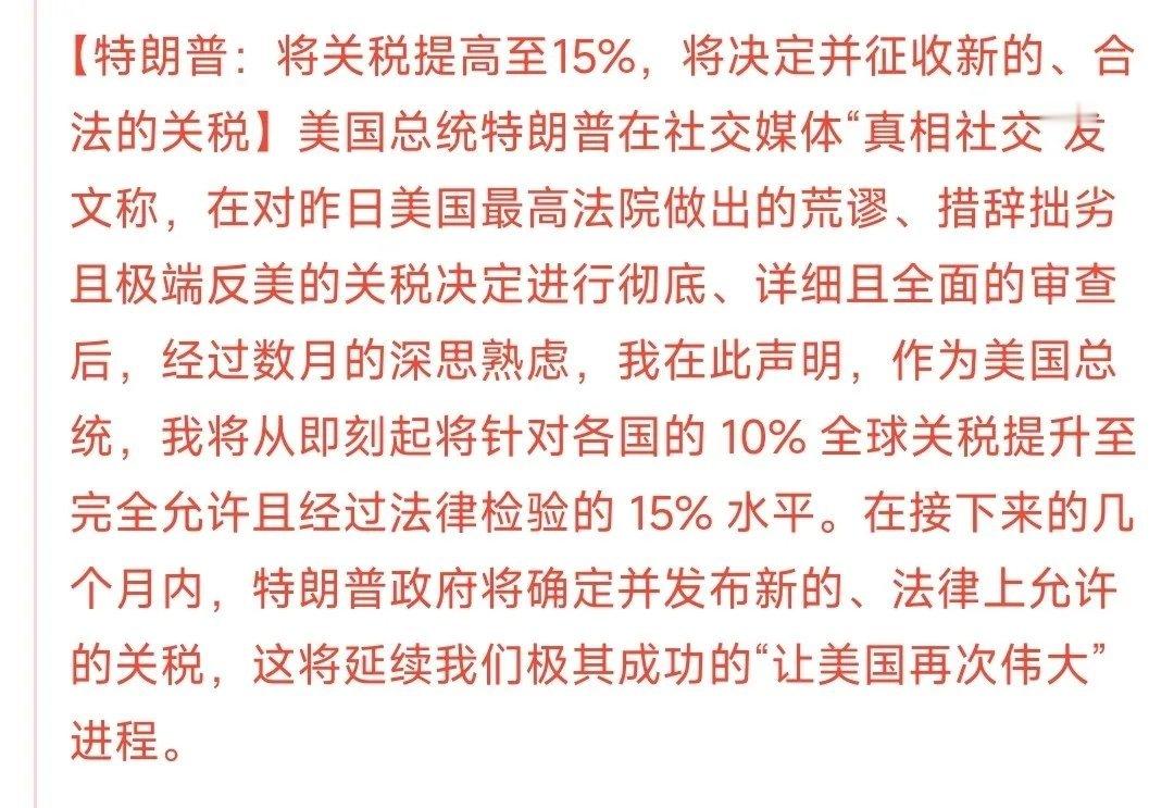 这次不管什么盟友不盟友,也不管以前有没有谈好的协议,主打的一视同仁,所有国家把基础关税都从10%提到了15%。