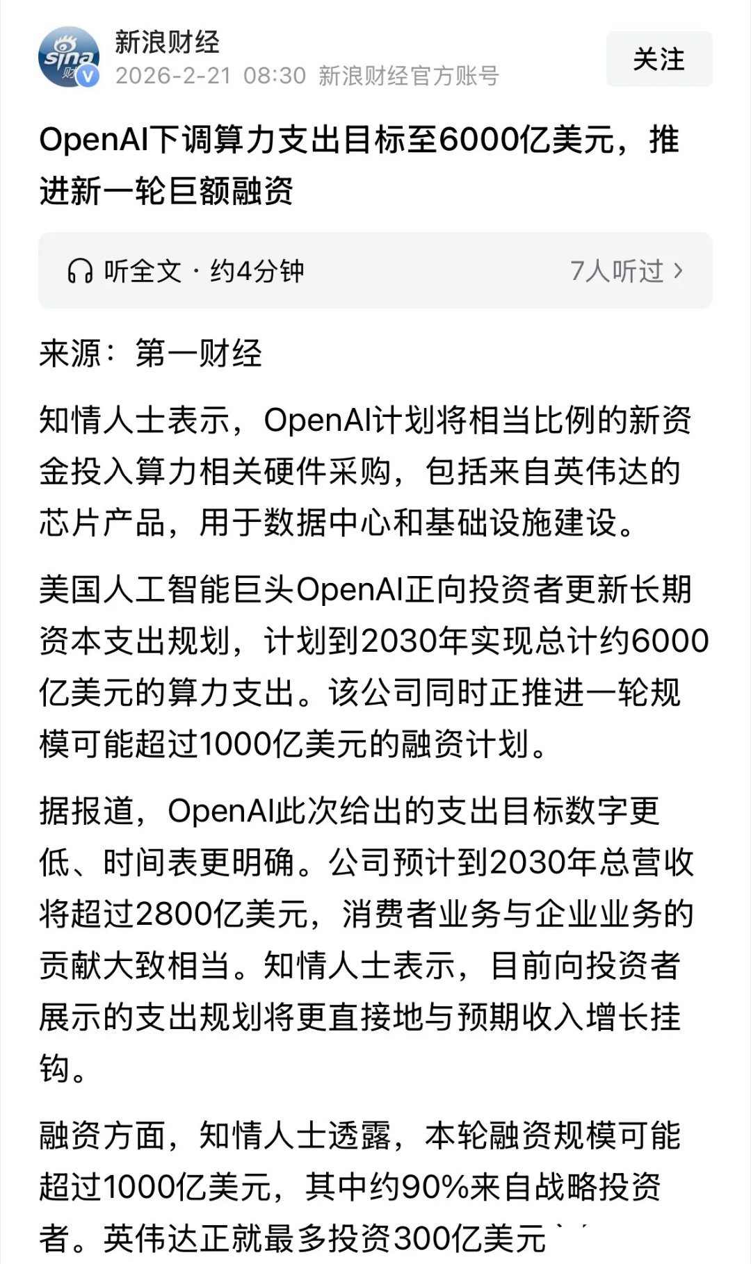 重大利好消息!OpenAI下调算力支出目标至6000亿美元,马年算力基建还是主线:这个周末很多不懂算力和CPO板块的人,说这是对英伟达和CPO板块重大利空。其实这是重大利好,推进新一轮巨额融资这消息早就有了,原来说的1.4万亿美元,是说未来8年1.4万亿美元基建,包含了算力、电力、生态,算下来一年算力投资也就不到1800亿美元,如今说的是2026年到2030年,纯算力支出6000亿美元,一年纯算力支出就超过1200亿美元,相当于过去10年全球总算力支出,这还是一家公司的支出。1.4 万亿美元是公司以前画的大饼,还引发了市场担忧,6000 亿美元现在缩成能落地的预算,所以这是重大利好消息,看英伟达和美股CPO的表现就知道了,春节期间美股CPO都大涨创新高了,下周一再看看。