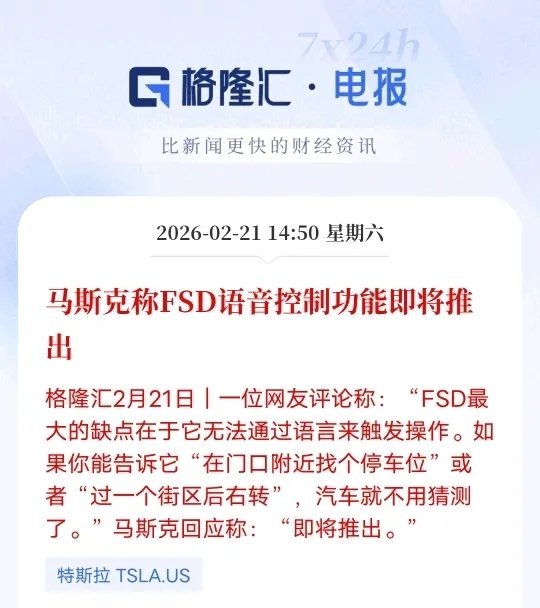2月21日消息,网友建议FSD增加语音操控,马斯克直接回应:即将推出。以后只需口头说“门口附近找车位”“过一个街区右转”,车辆就能精准执行。这不是普通语音助手,而是自然语言+自动驾驶深度融合。过去靠屏幕操作,不安全、效率低;现在用语音直连智驾,减少车辆猜意图、车主手动干预,驾驶更流畅更安全。这一步补齐FSD最后一块交互短板,自动驾驶从“自动行驶”迈向“听懂人话”,真正解放双手双脚,智能出行再进化。