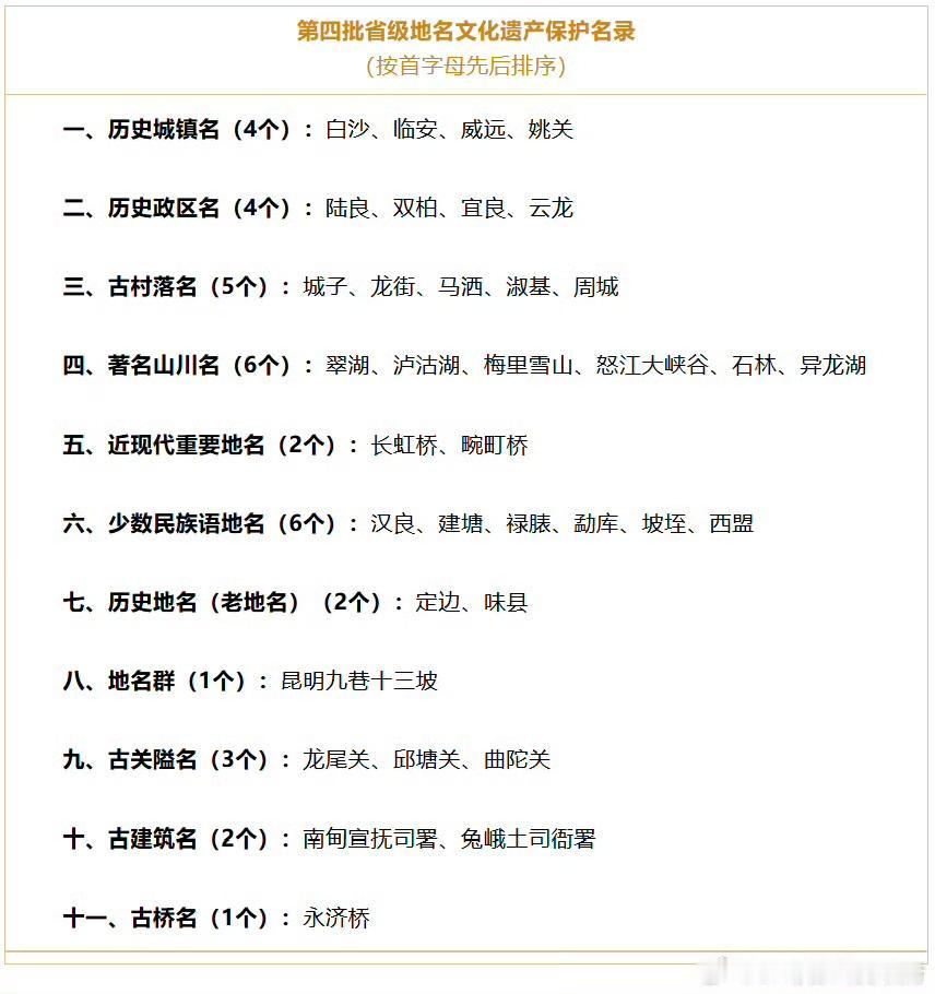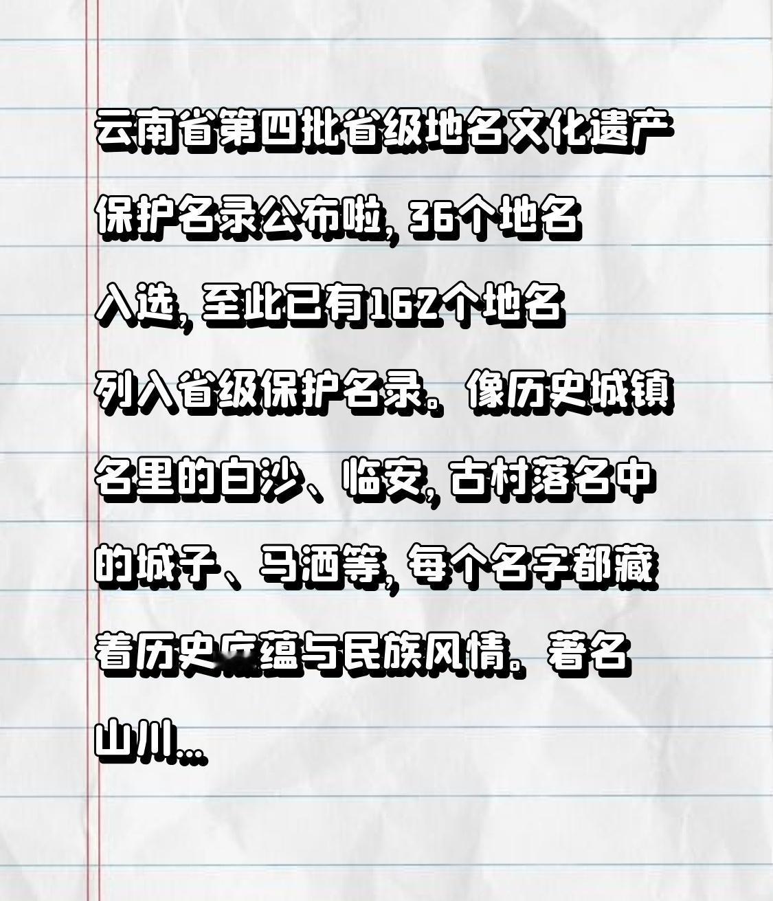 云南省第四批省级地名文化遗产保护名录公布啦,36个地名入选,至此已有162个地名列入省级保护名录。 像历史城镇名里的白沙、临安,古村落名中的城子、马洒等,每个名字都藏着历史底蕴与民族风情。大理云龙、周城、龙尾关入选。云南地名 著名山川名如翠湖、泸沽湖、梅里雪山等,光是听名字就仿佛能看到如画的风景。还有近现代重要地名长虹桥、畹町桥,承载着特殊的历史意义。这些地名连接着乡愁与记忆,守护和传承它们,能让我们更好地读懂“有一种叫云南的生活”。 云南旅行必去地 云南景点排名 云南名景 云南标志 云南村落