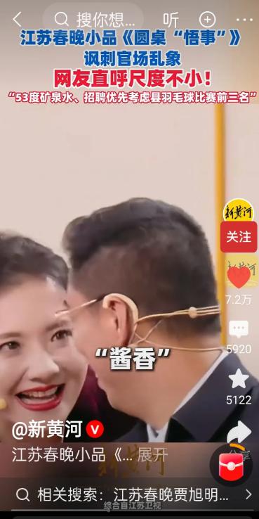 封神!这两天全网都在传江苏春晚小品的这瓶“53度酱香矿泉水”! 一瓶矿泉水,标着“53度”,闻起来是酱香型。这哪是水,明明就是白酒嘛。江苏卫视春晚的小品《圆桌“悟事”》,就用这么一瓶水,把酒桌上的那点事,说得明明白白。 这小品,真敢说。它不光说了酒,还说了职场的猫腻。小品里有个招聘,要求24到26岁,还得是县羽毛球赛前两名。这条件卡得,明摆着就是给特定的人留的“萝卜坑”。 演员贾旭明他们演得特别实在。没有特别夸张的搞笑,就是平平常常地说话,可每一句都说在点子上。把那些大家平时见过、甚至经历过的歪风邪气,都摊开来说了。 酒桌上,用矿泉水瓶装酒,假装是喝水。为啥?为了躲检查,为了搞关系。职场上,设个离谱的招聘条件,为了啥?就是为了把位置留给“自己人”。 这些事,好多人都在生活中碰到过,或者听说过。但平时没法说,也不敢说。现在有个小品,直接把它演出来了,看得人心里直呼“爽”。 为啥爽?因为它替普通人说话了。说出了大家求职时的痛点,说出了大家对不公平现象的不满。 艺术就得来自生活。老搞那些高高在上、谁也看不懂的东西,没人爱看。像这样,敢碰现实,有锋芒,又接地气的小品,才是大家真正想看的“好东西”。 网友都说,这样的小品应该多来点。它不一定是要教育谁,就是反映一下生活中真实存在的问题。让大家看看,笑笑,再想想。 江苏卫视能上这样的小品,也挺有担当。不怕碰话题,敢把现实的一面搬上舞台。这样的作品,才配叫“天花板”。希望以后,这样的节目能再多一些。 对此,你怎么看?