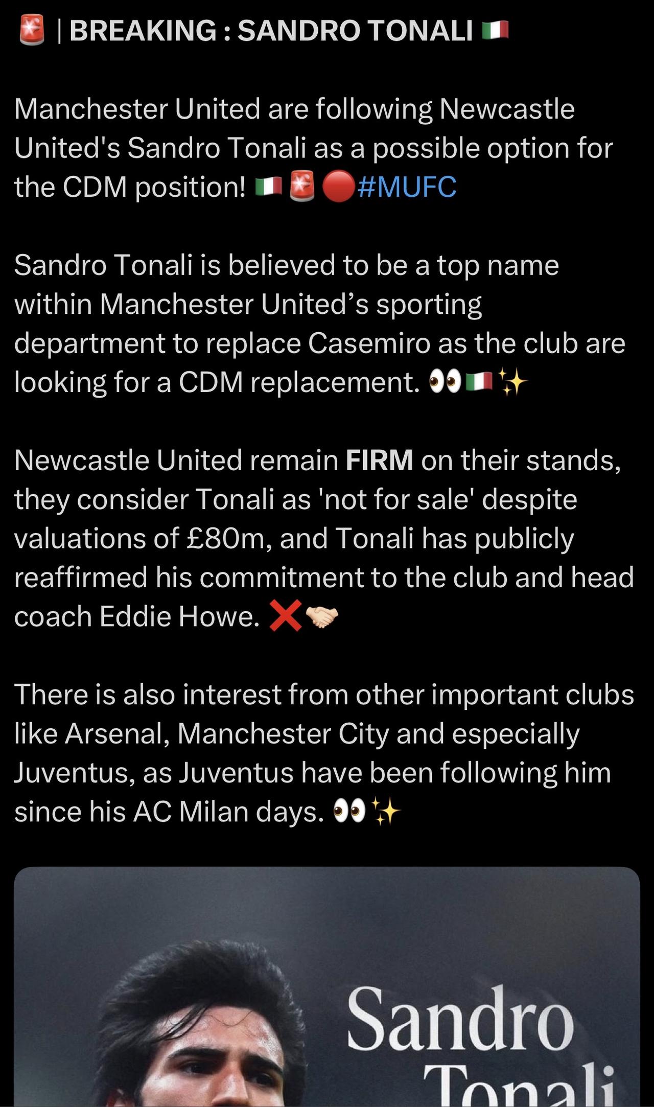 去年的伊萨克,今年的托纳利,更加说明 纽卡的金主 有2个问题: 1,就是不像 曼城的那么会做账,曼城随便搞个青训场地墙壁刷个漆,都能算一笔赞助[捂脸] 2,不敢请名帅,冒险冲击联赛冠军。 ……………………………………………………………… 曼联正在关注纽卡斯尔联队的桑德罗·托纳利,将其视为后腰位置的潜在人选! 据信,桑德罗·托纳利是曼联体育部门接替卡塞米罗的热门人选,俱乐部正在寻找一名后腰替代者。 纽卡斯尔联队立场坚定,尽管托纳利的估价高达8000万英镑,但他们仍然认为他是“非卖品”。托纳利也公开重申了他对俱乐部和主教练埃迪·豪的忠诚。 其他一些重要俱乐部,如阿森纳、曼城,尤其是尤文图斯,也对他很感兴趣,因为尤文图斯从他还在AC米兰时期就开始关注他了。