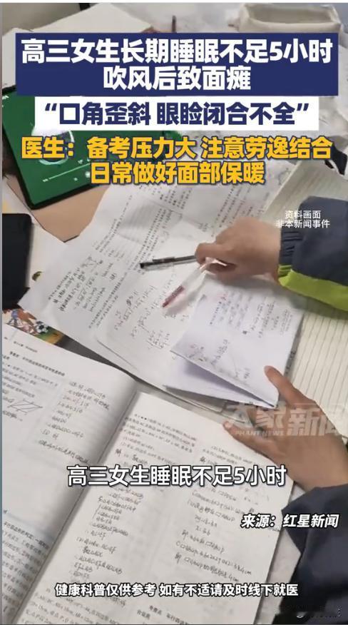 “悲剧还是发生了!”近日,一女生上高三后,压力倍增,经常很晚才下晚自习,回家后又熬夜学习,长期睡眠不足5小时。这天她在骑车回家后竟出现口角歪斜、眼睑闭合不全的症状,就医后才得知是免疫力下降导致的。网友:备考也要顾身体! 高三阶段学业压力大,很多学生都在熬夜冲刺,但长期睡眠不足会让身体免疫力急剧下降,再加上吹风受凉,就容易引发健康问题。 据媒体2月3日报道,这位17岁的女生为了备考,每天埋首书山题海,常常学习到深夜,平均睡眠时间不足5小时。 这天晚上下自习后,她像往常一样骑车回家,没做好面部保暖,迎着冷风走了一段路。结果第二天一早,她就感觉一侧面部僵硬发麻,照镜子才发现自己口角歪斜,眼睛也无法完全闭合,连喝水都容易漏出。 家人见状连忙带她就医,医生经过详细检查后,确诊为面神经炎,明确表示发病与她长期睡眠不足、身体免疫力低下,再加上面部突然受凉有直接关系,所幸送医及时,若再晚一步,很可能会留下面部肌肉僵硬、口角歪斜的后遗症。 这件事也给所有备考的学生、家长和老师提了个醒,高考冲刺固然重要,但身体健康才是一切的根本。冲刺学业的同时,一定要保证充足的睡眠,做好日常保暖,合理安排作息,做到劳逸结合,只有拥有健康的身体,才能在考场上发挥出最佳水平。 信息来源:《每天睡眠不足5小时+吹凉风,高三女生熬夜备考患面神经炎,医生提醒:很容易和“中风”混淆发病72小时是黄金治疗期》经视直播