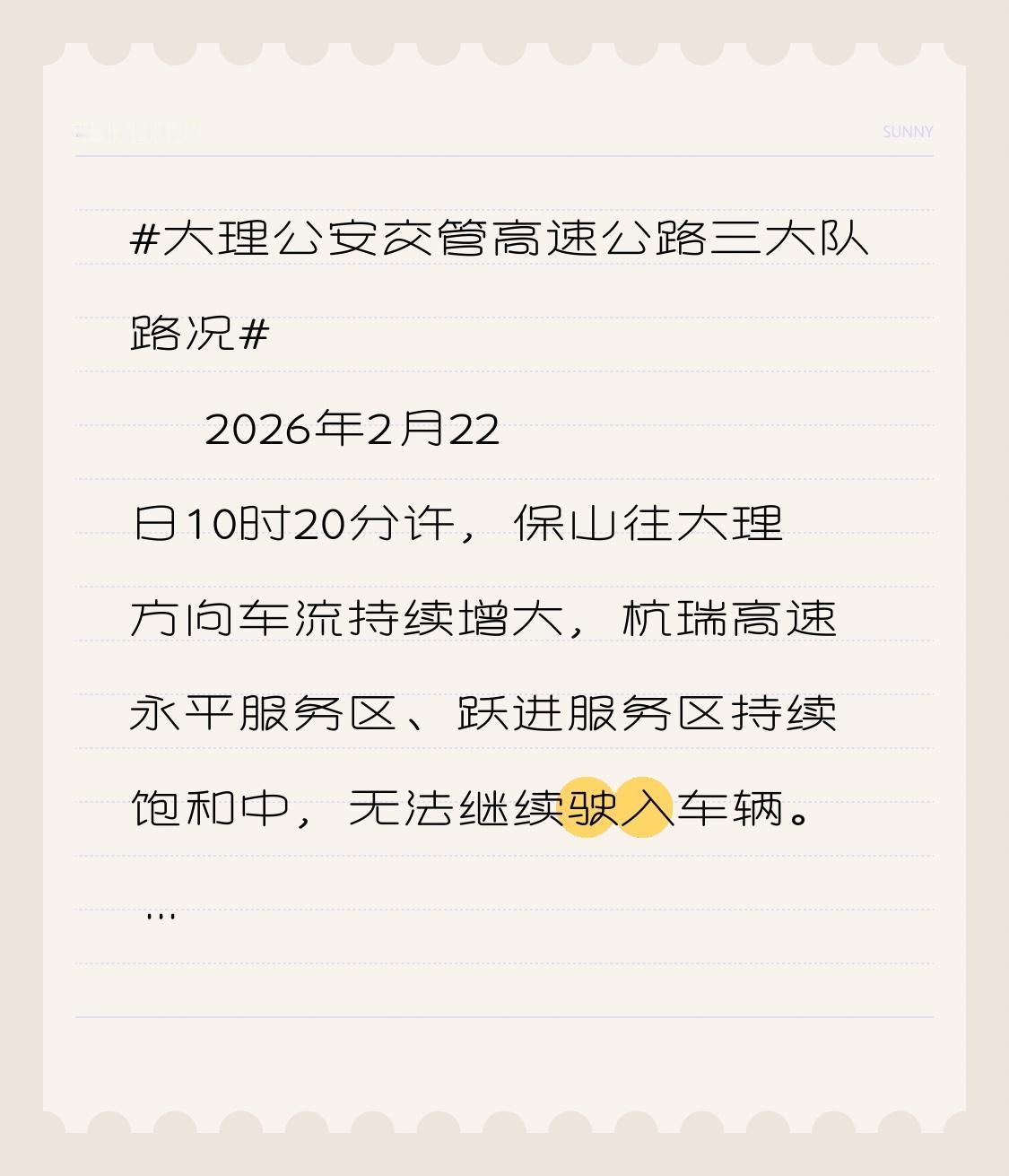 2026年2月22日10时20分许,保山往大理方向车流持续增大,杭瑞高速永平服务区、跃进服务区持续饱和中,无法继续驶入车辆。 计划在永平服务区(杭瑞高速K2650附近)休息的车辆,继续往前行驶0.5公里至永平收费站驶离高速,加油、充电休整。 计划在跃进服务区(杭瑞高速K2595附近)休息的车辆,建议提前在顺濞收费站驶离高速,或继续往前行驶19公里至平坡收费站驶离高速,加油、充电休整。 在高速公路排队易发生事故,请向前行驶。 2026年2月22日9时许,保山往大理方向杭瑞高速跃进服务区即将饱和。 计划在该服务区(杭瑞高速K2595附近)休息的车辆,提前在顺濞收费站驶离高速,或继续往前行驶19公里至平坡收费站驶离高速,加油、充电休整。 在高速公路排队易发生事故,请向前行驶。 大理路况 云南高速路况 云南交通路况 高速公路 实时路况