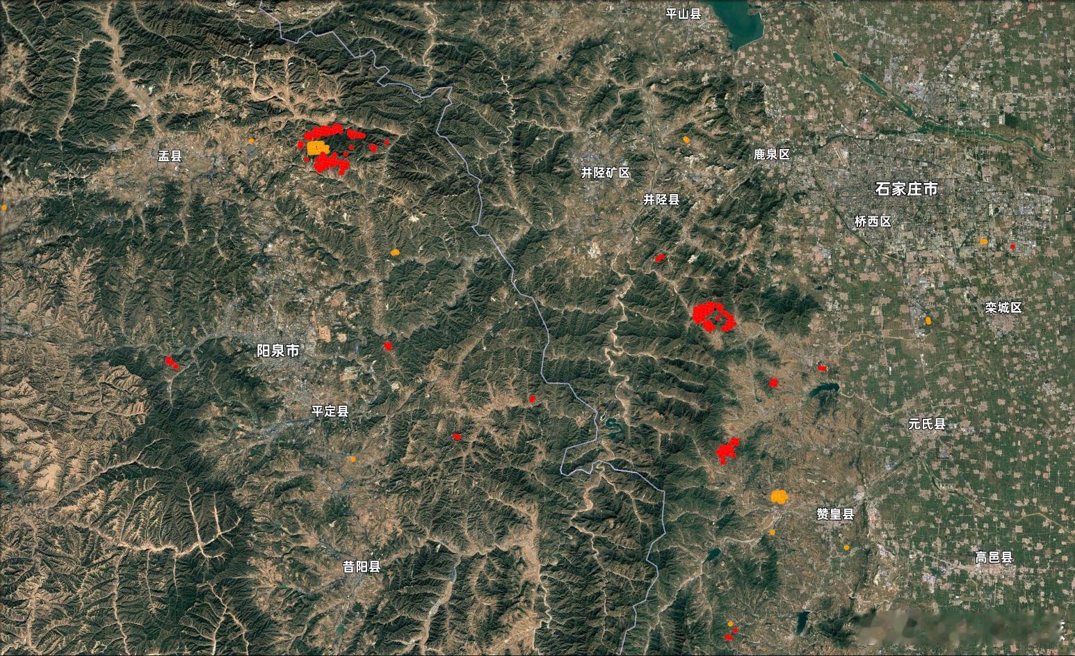 相较于石家庄山火 山西阳泉的山火面积看起来更大些阳泉山火 但阳泉的新闻热度完全不及石家庄。
